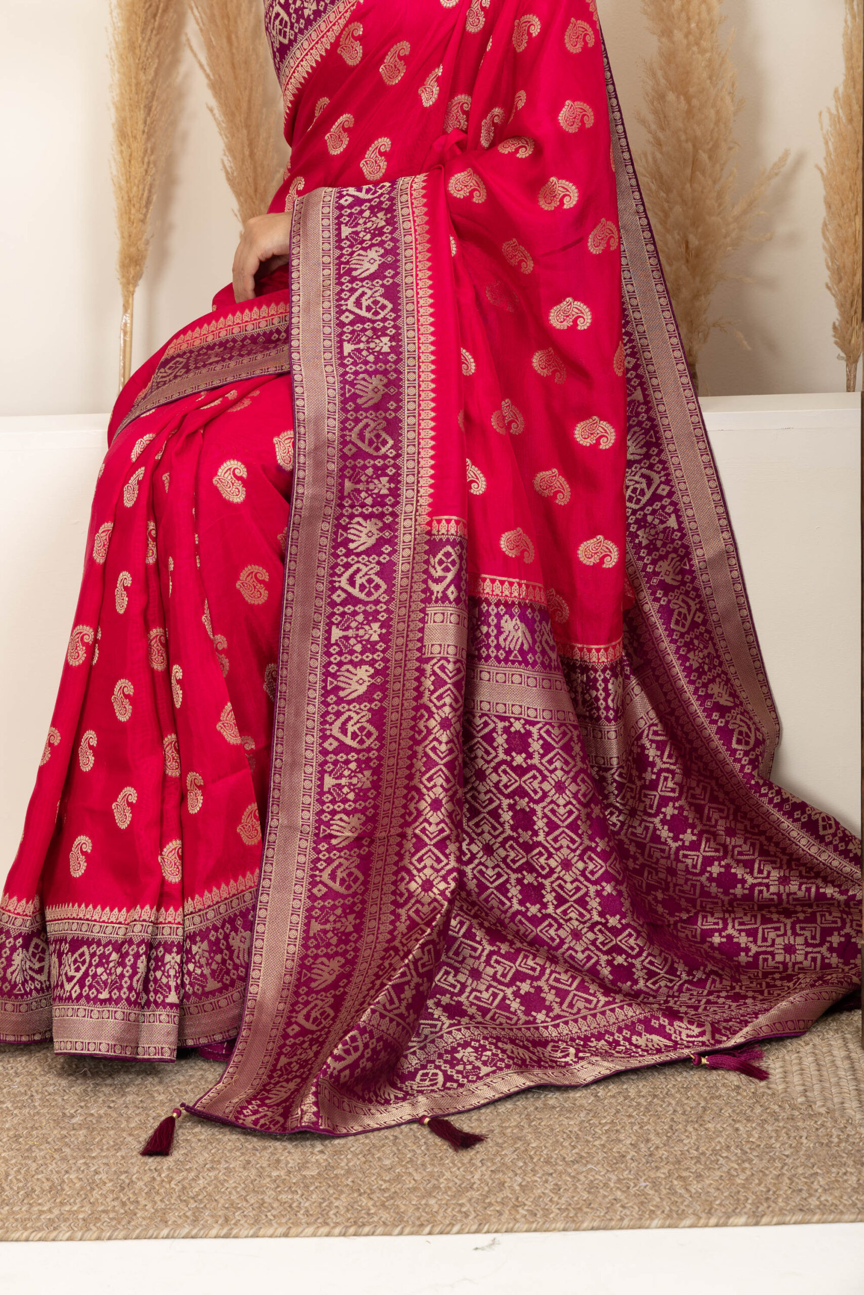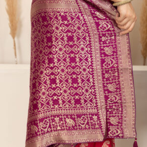 ● Border: Broad, intricately woven border in purple with detailed gold zari work
