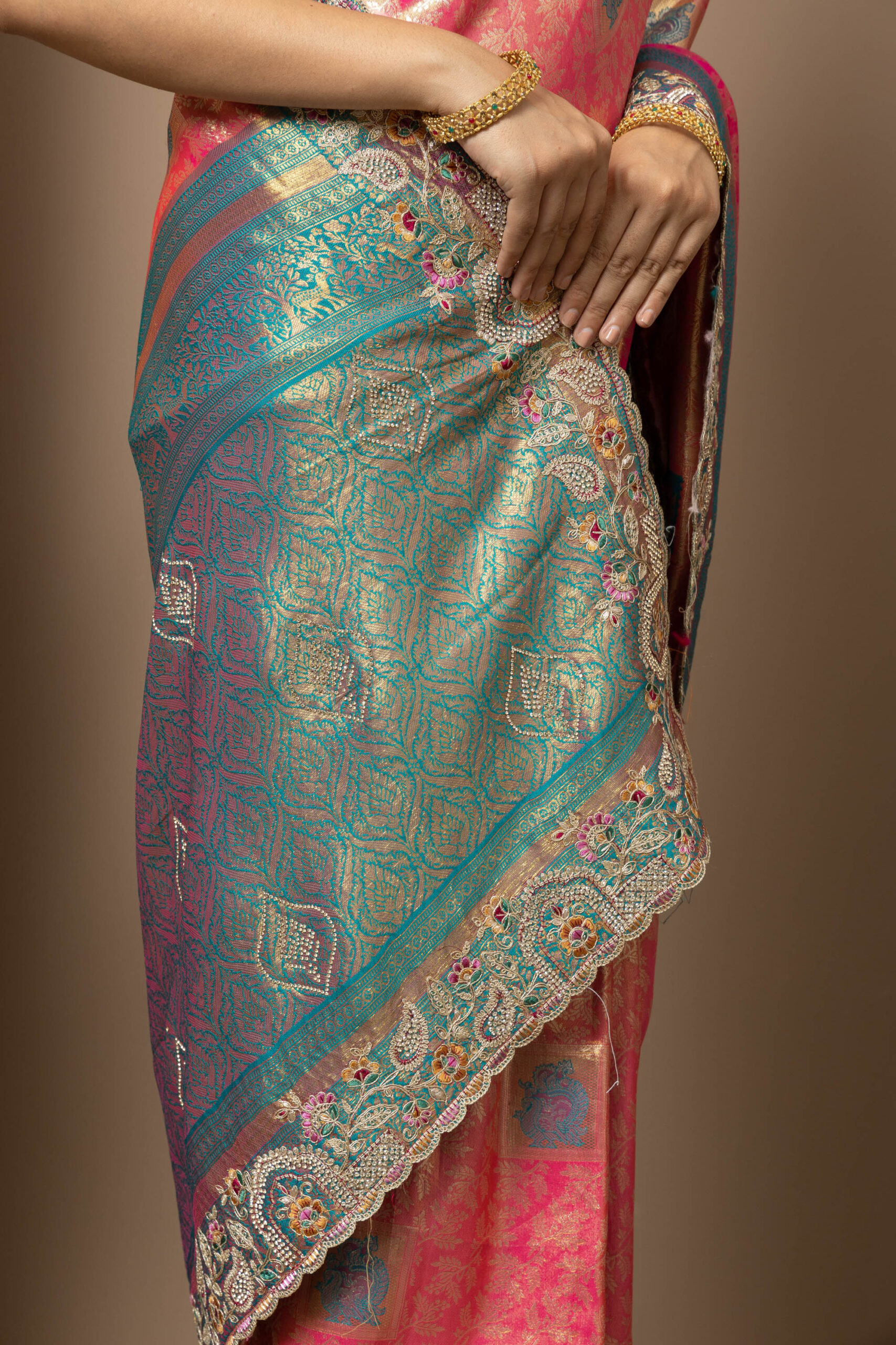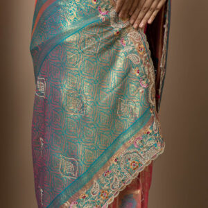 ● Border: Statement border featuring detailed embroidery and zari work in teal and gold