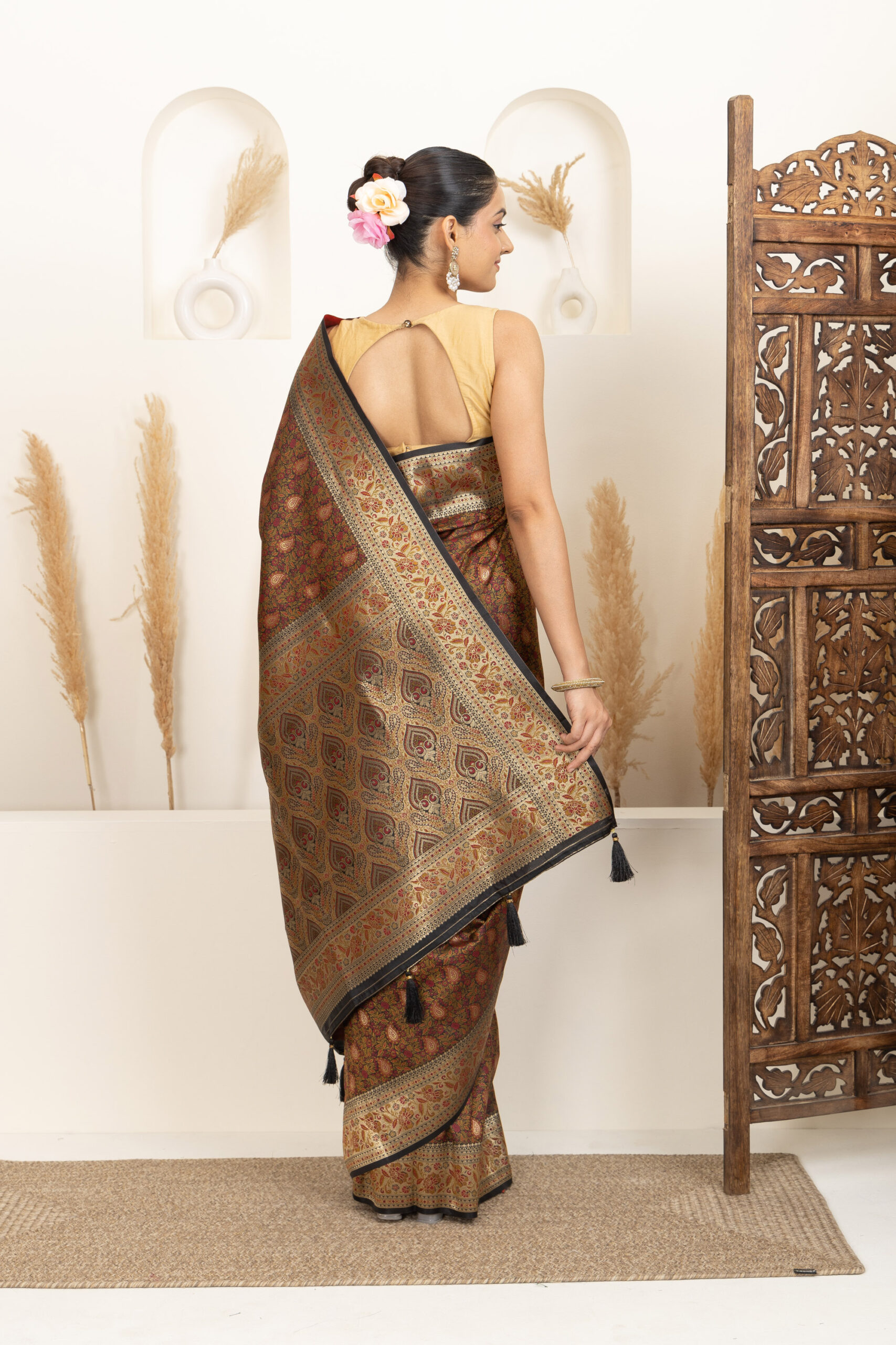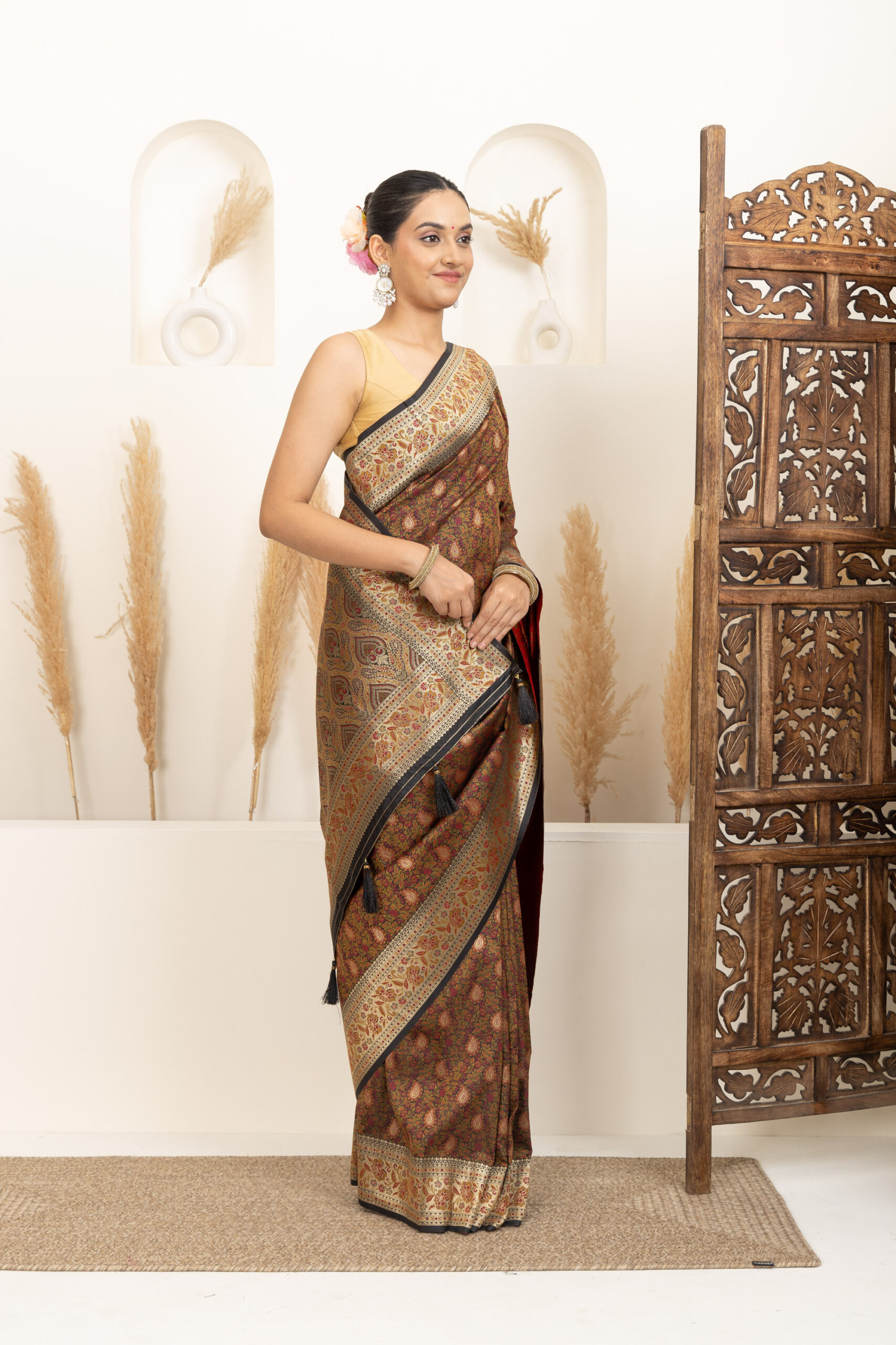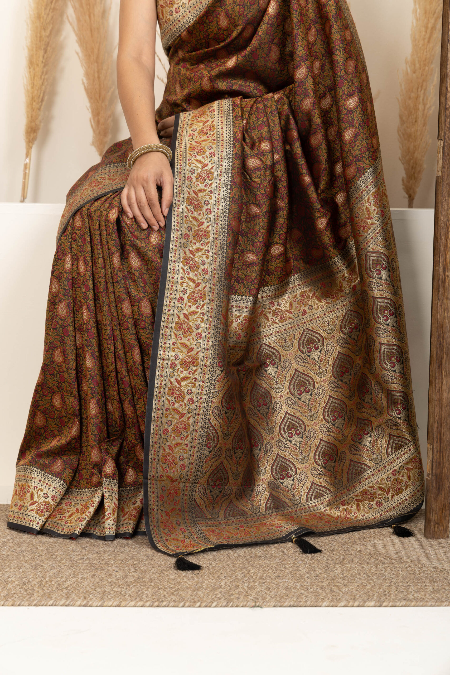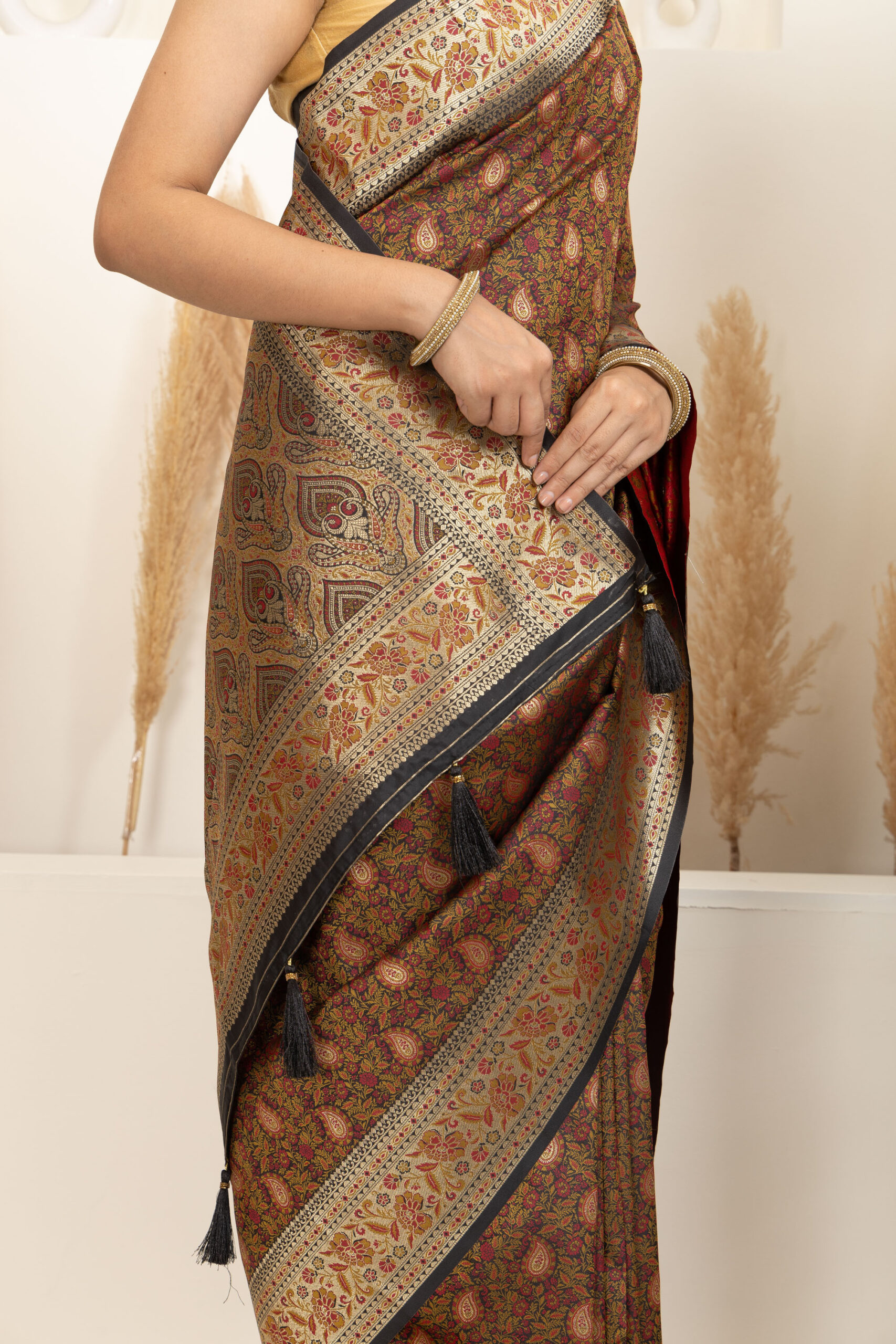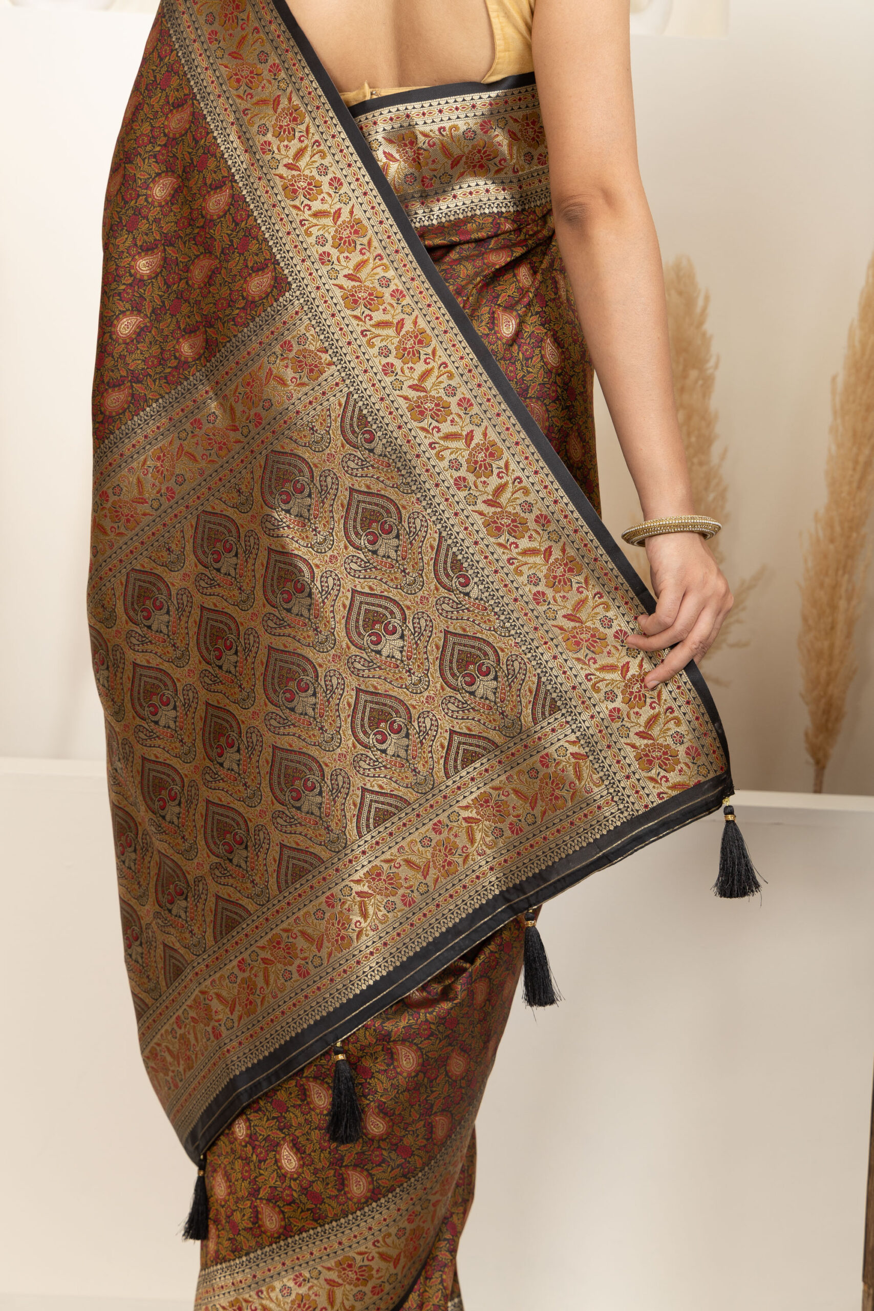 ● Pallu: Heavily designed pallu with elaborate weaving and tassel accents