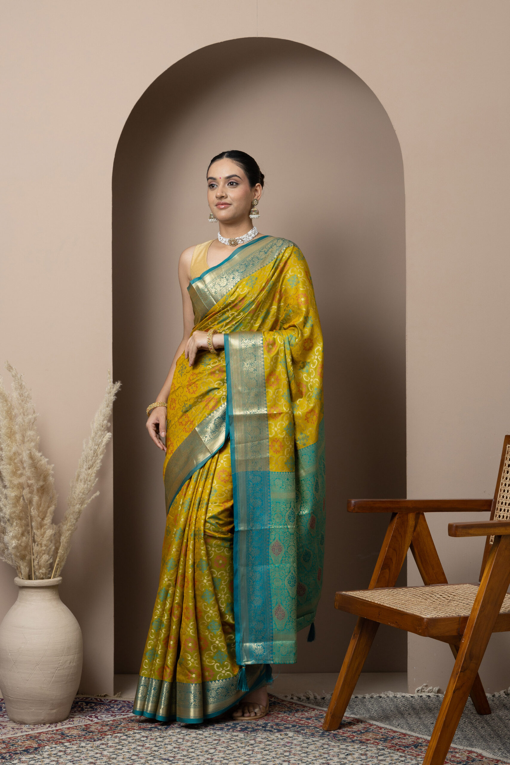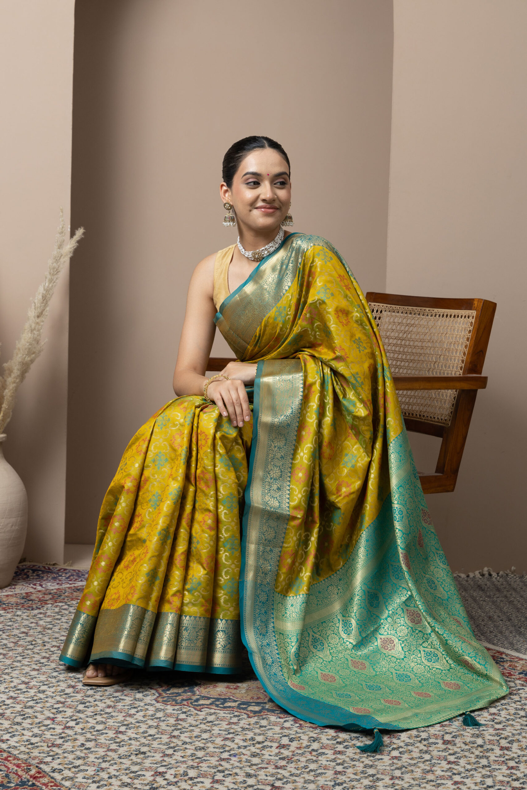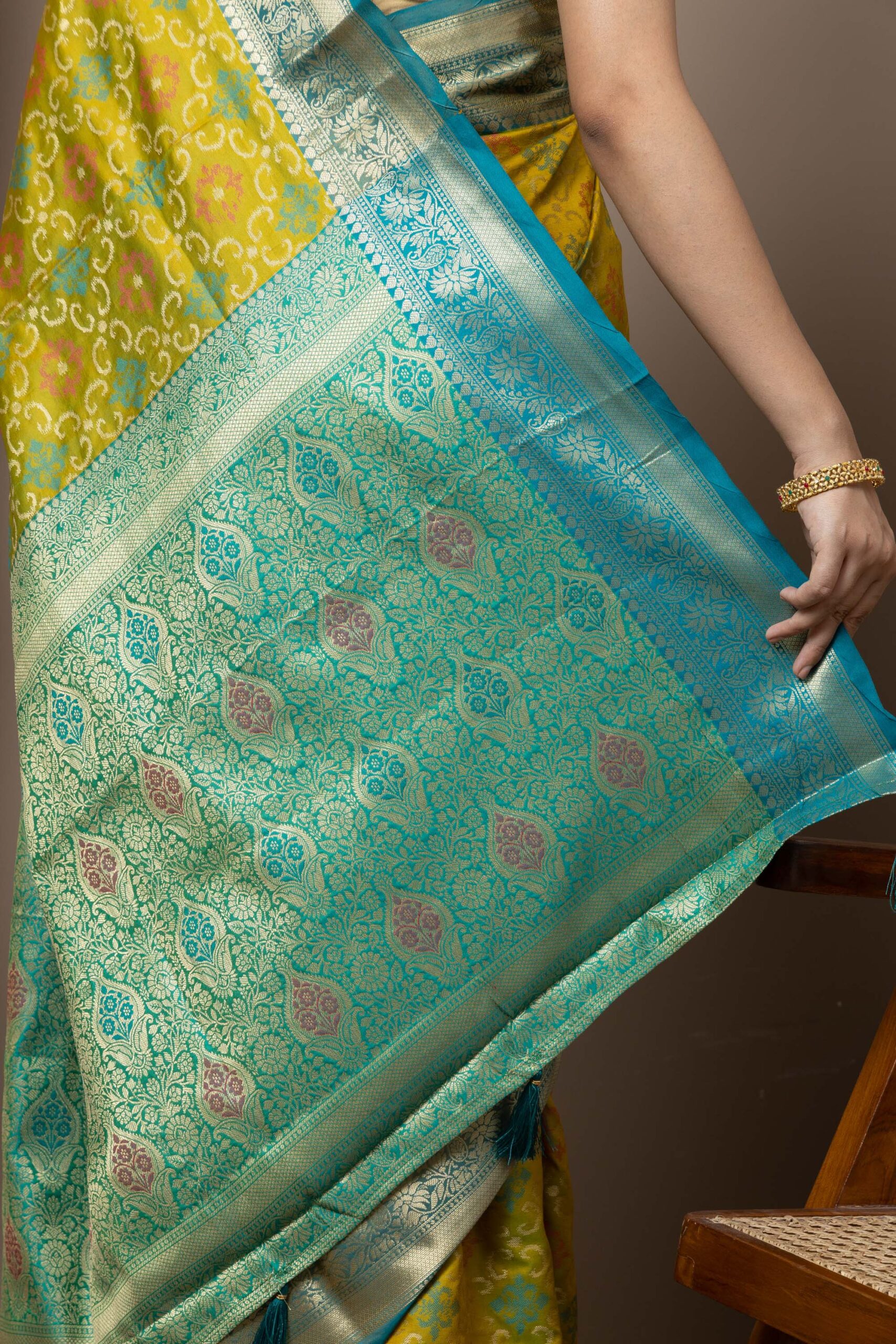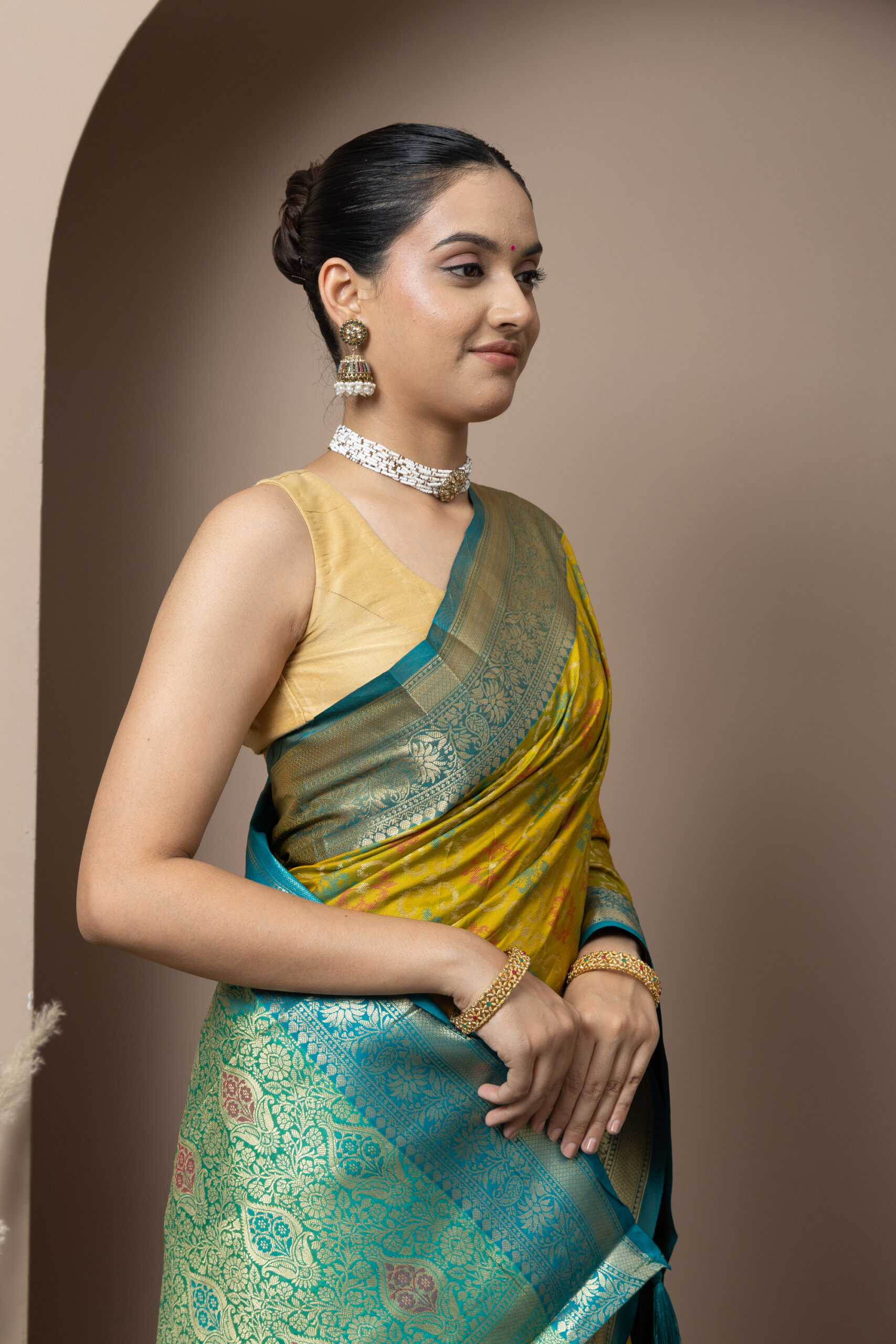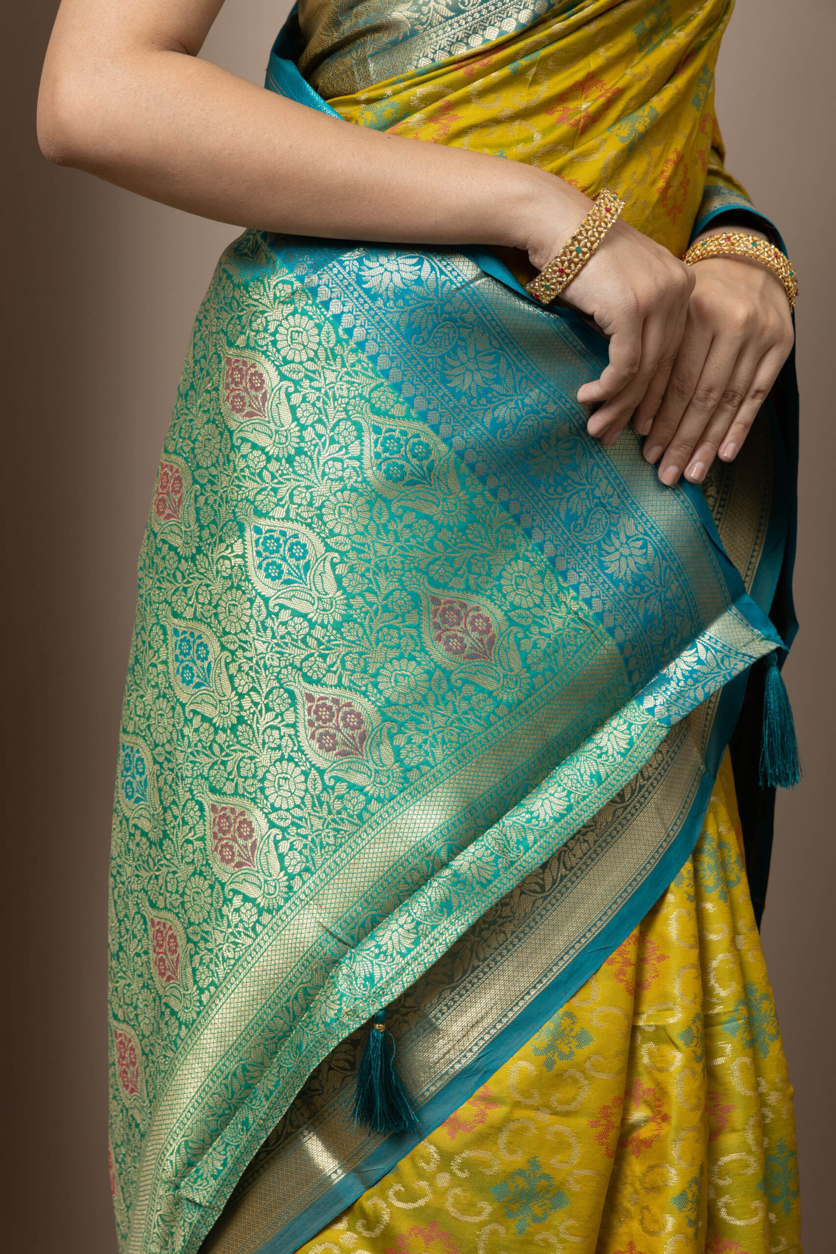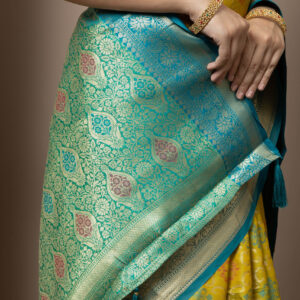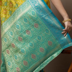 ● Border: Broad teal zari border with detailed weaving, adding depth and contrast