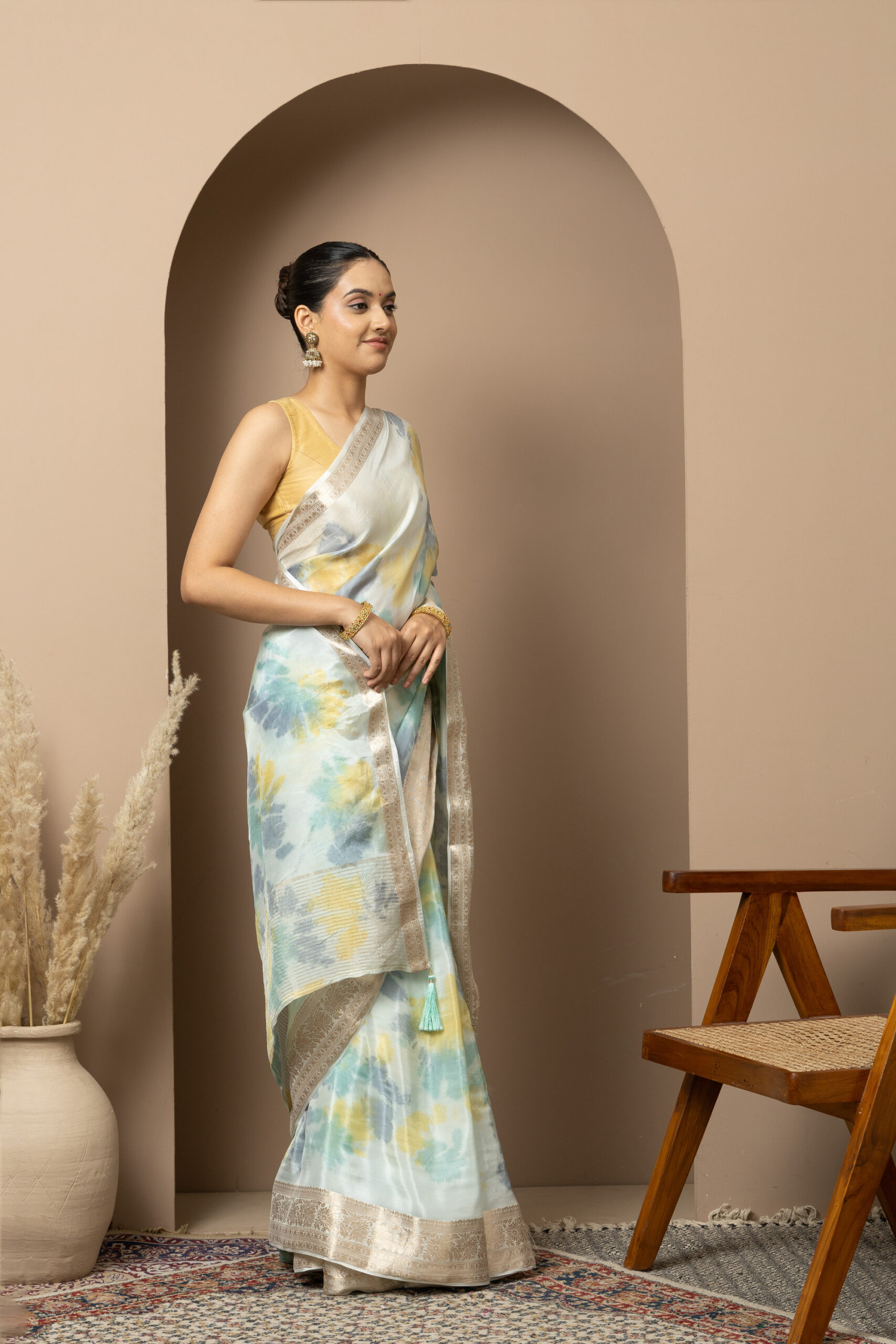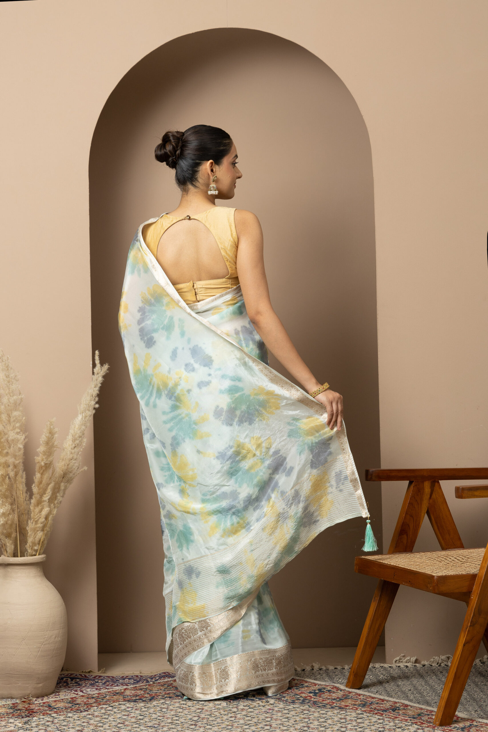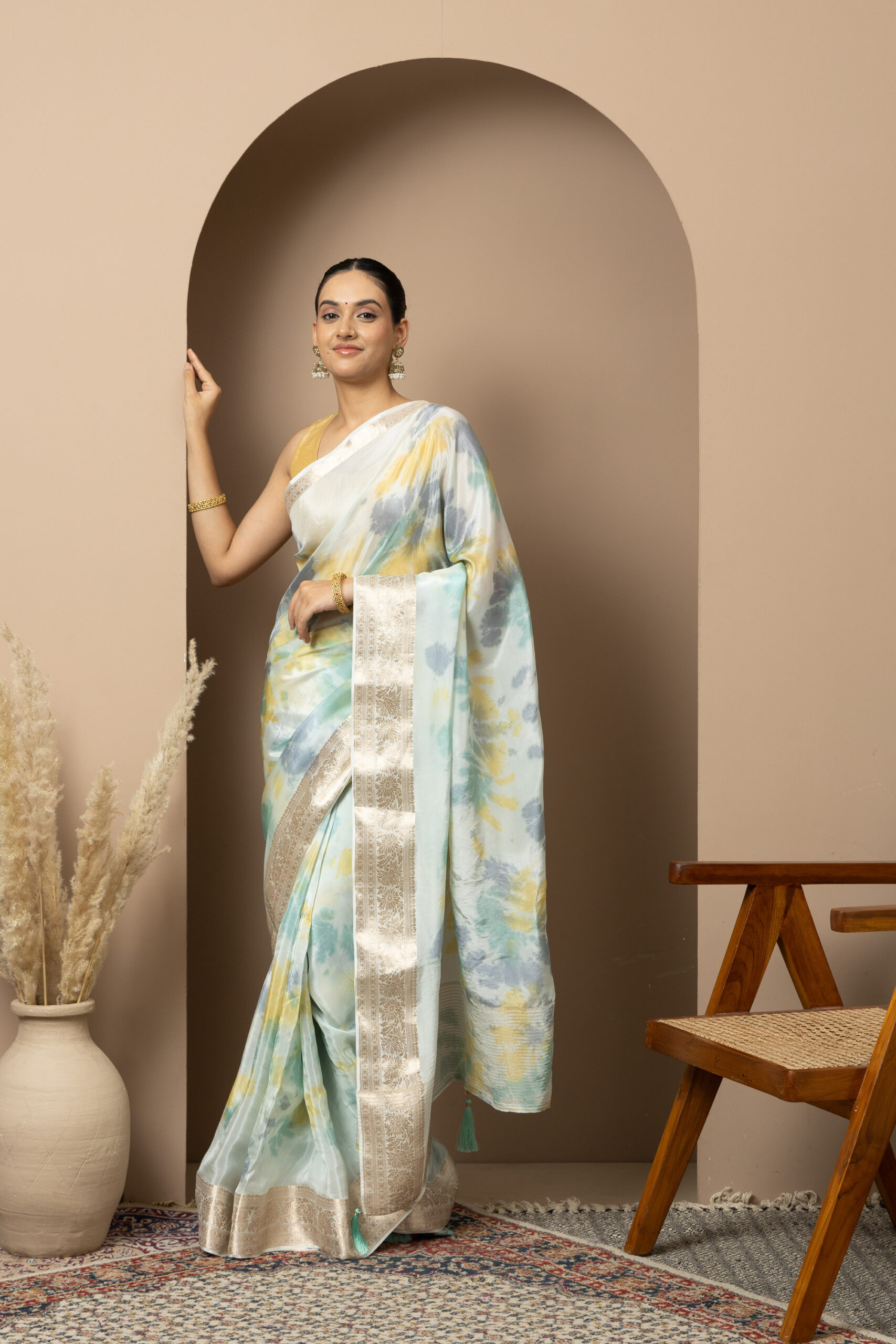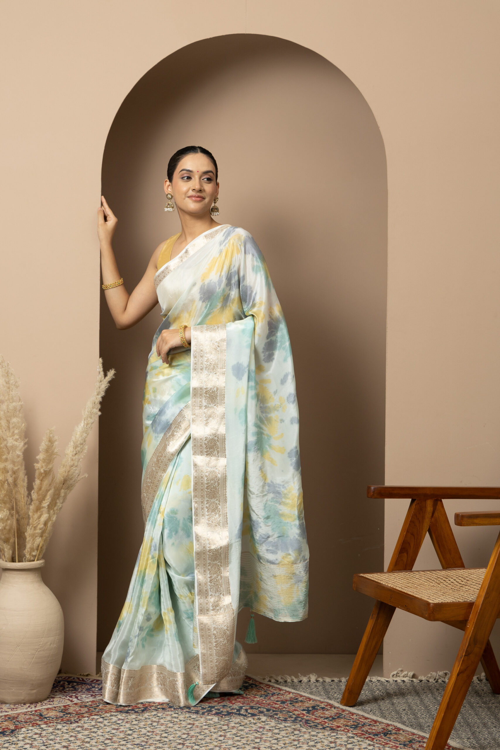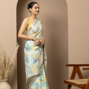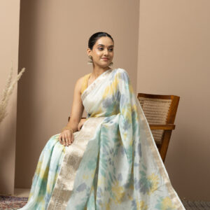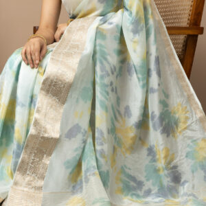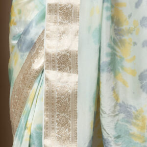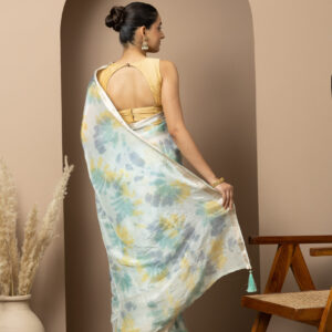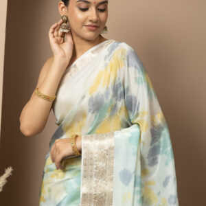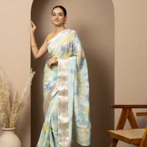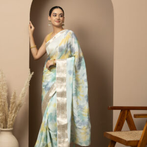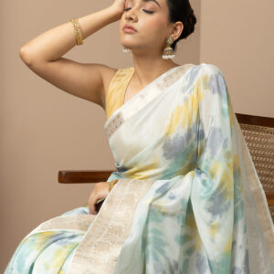Overall Style:  A breezy and modern saree perfect for daytime elegance. Its pastel tones and fluid drape make it ideal for brunches, casual festivities, and summer occasions.