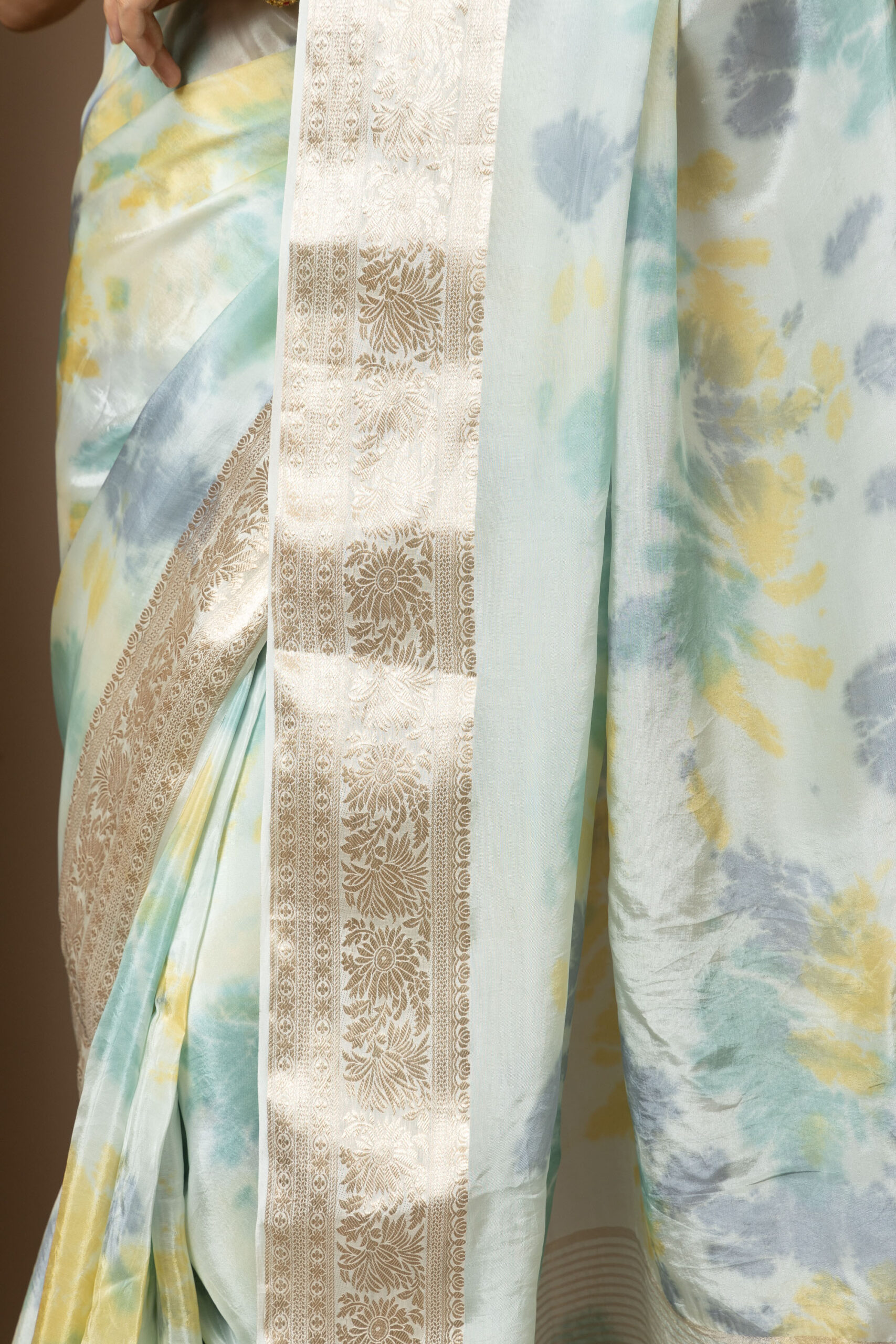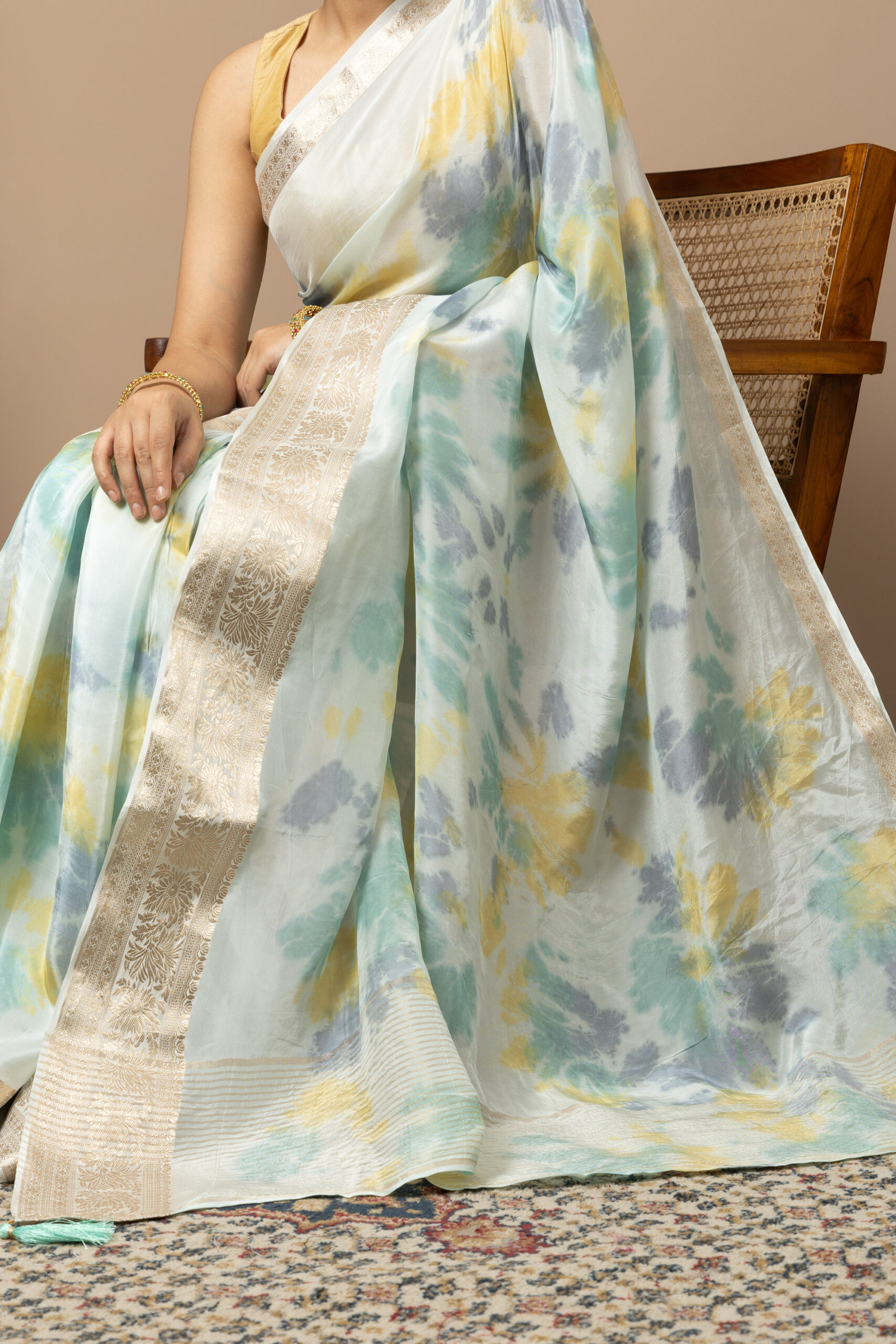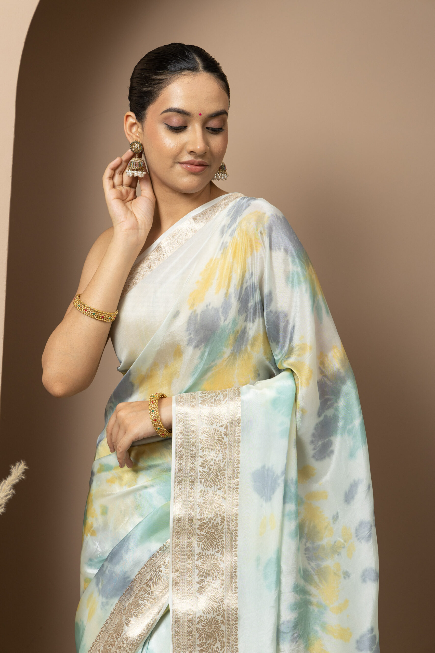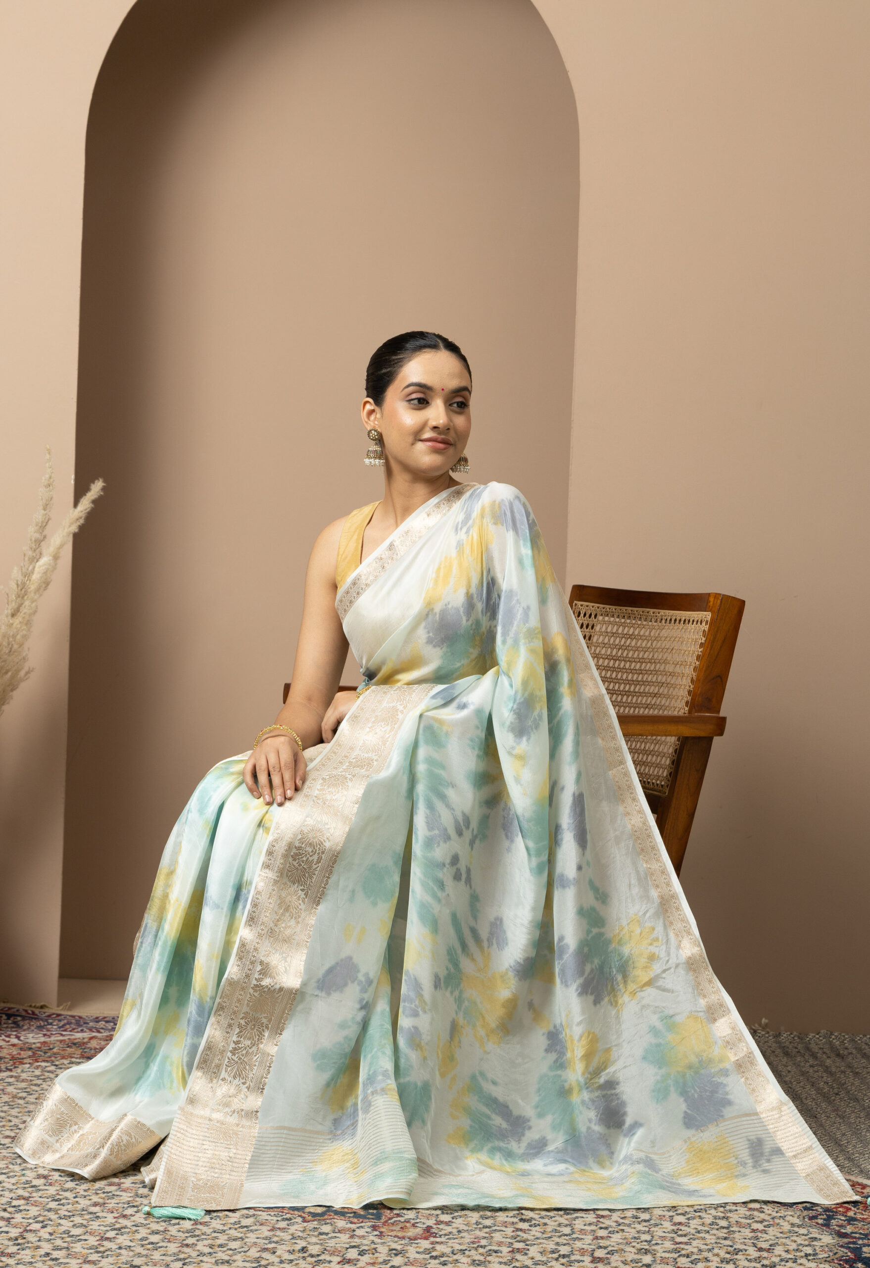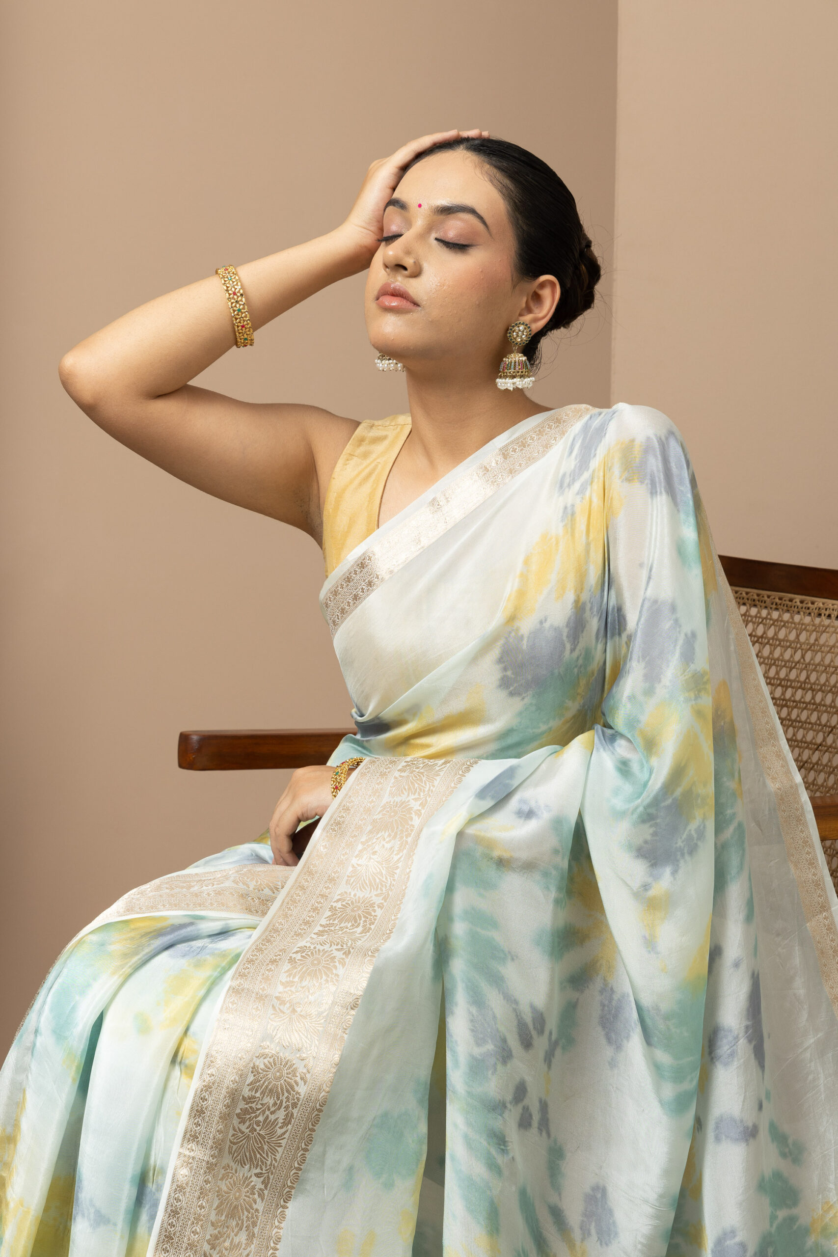 Overall Style:  A breezy and modern saree perfect for daytime elegance. Its pastel tones and fluid drape make it ideal for brunches, casual festivities, and summer occasions.