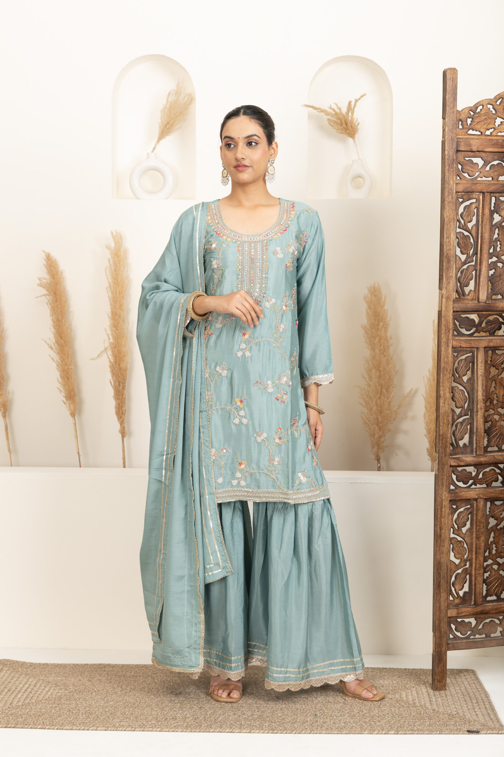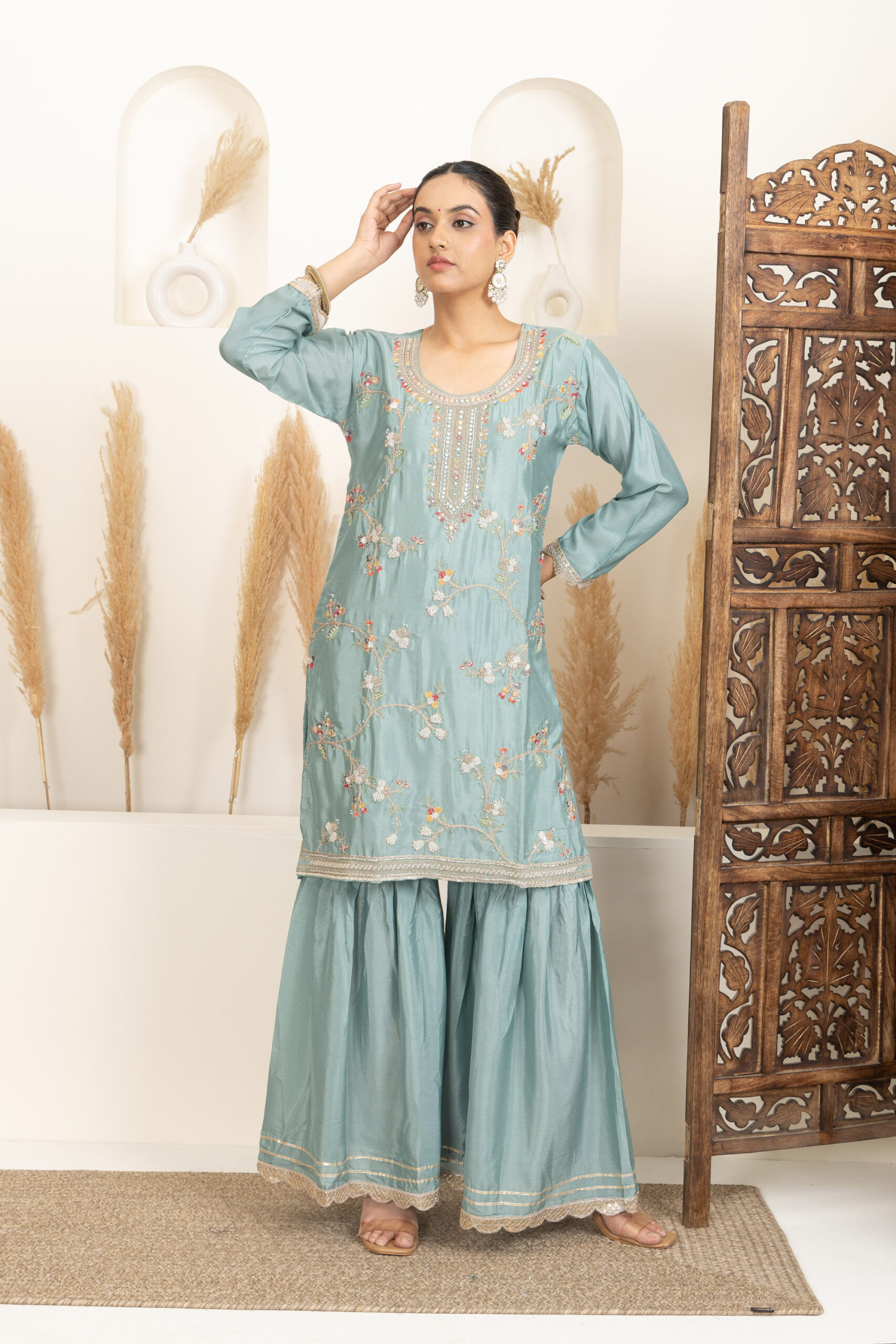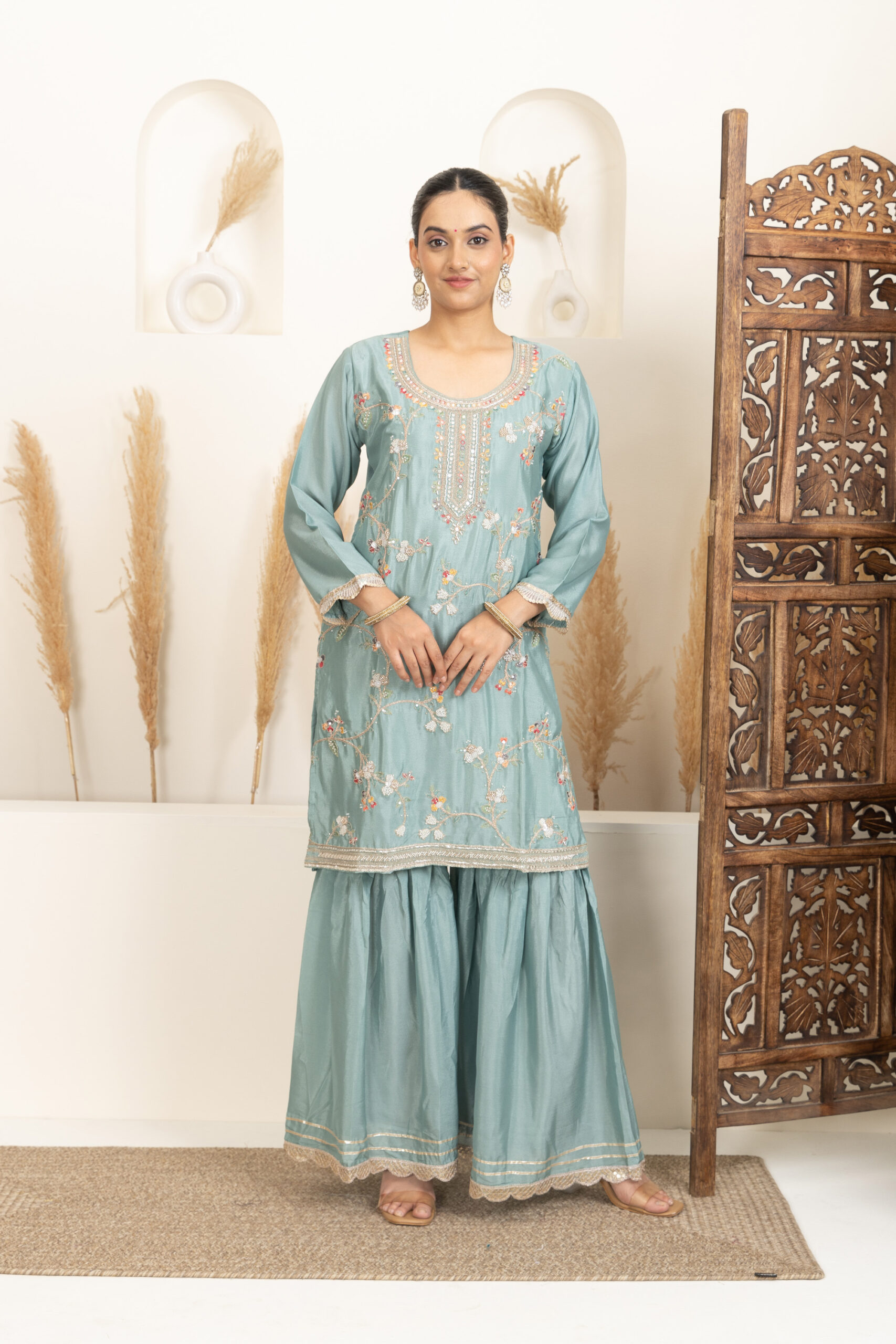 ● Bottom Fabric: Silk blend sharara with a flared silhouette
