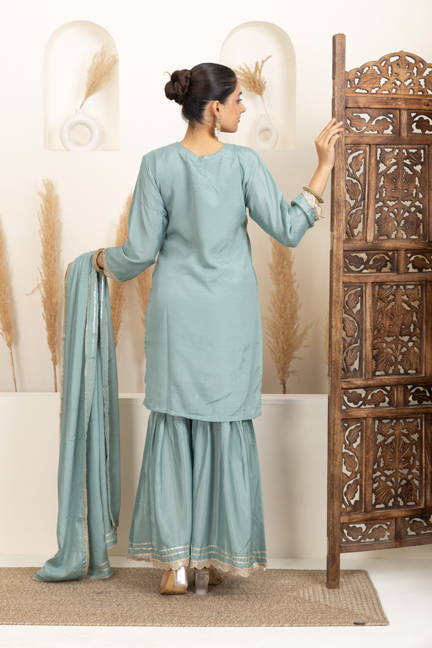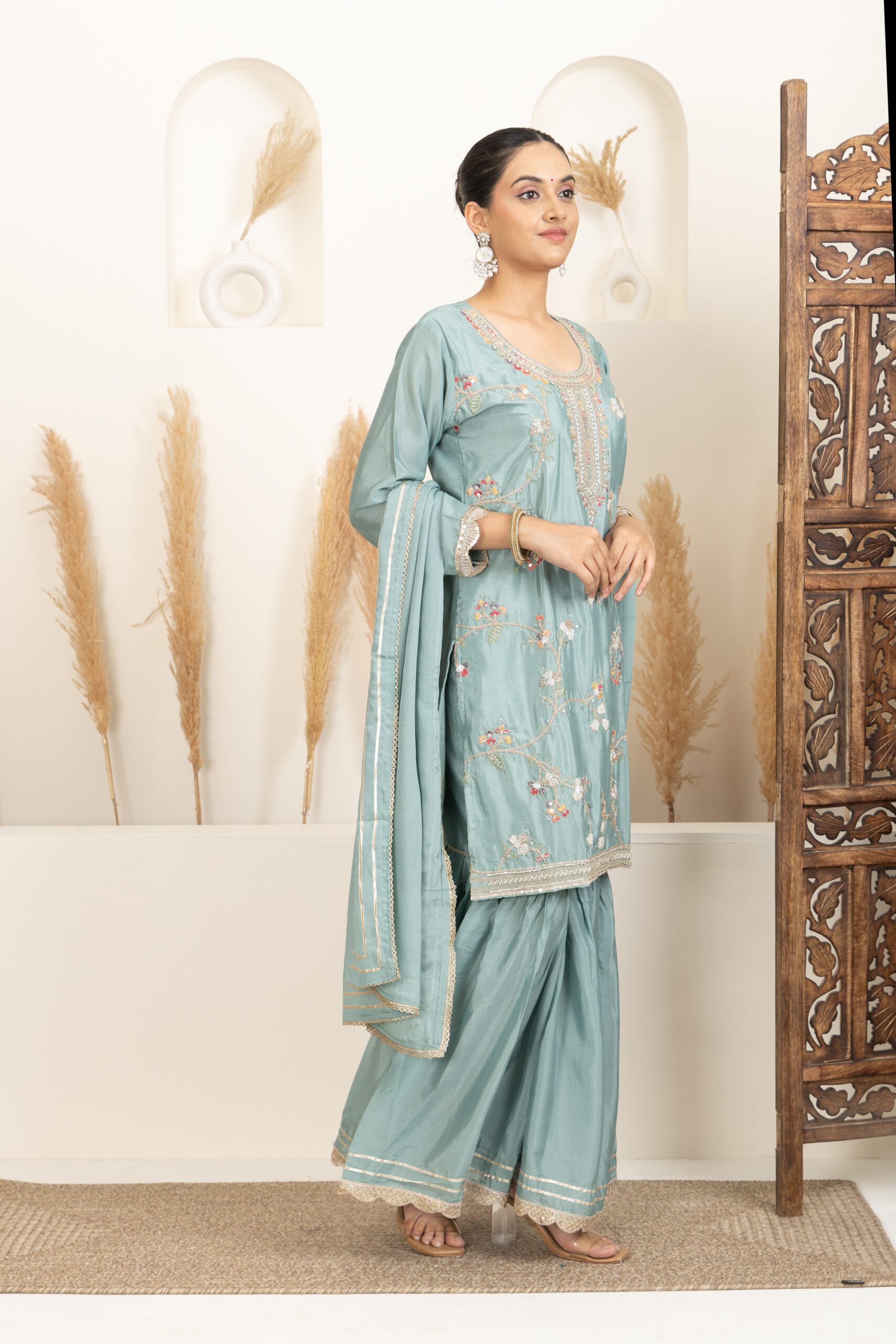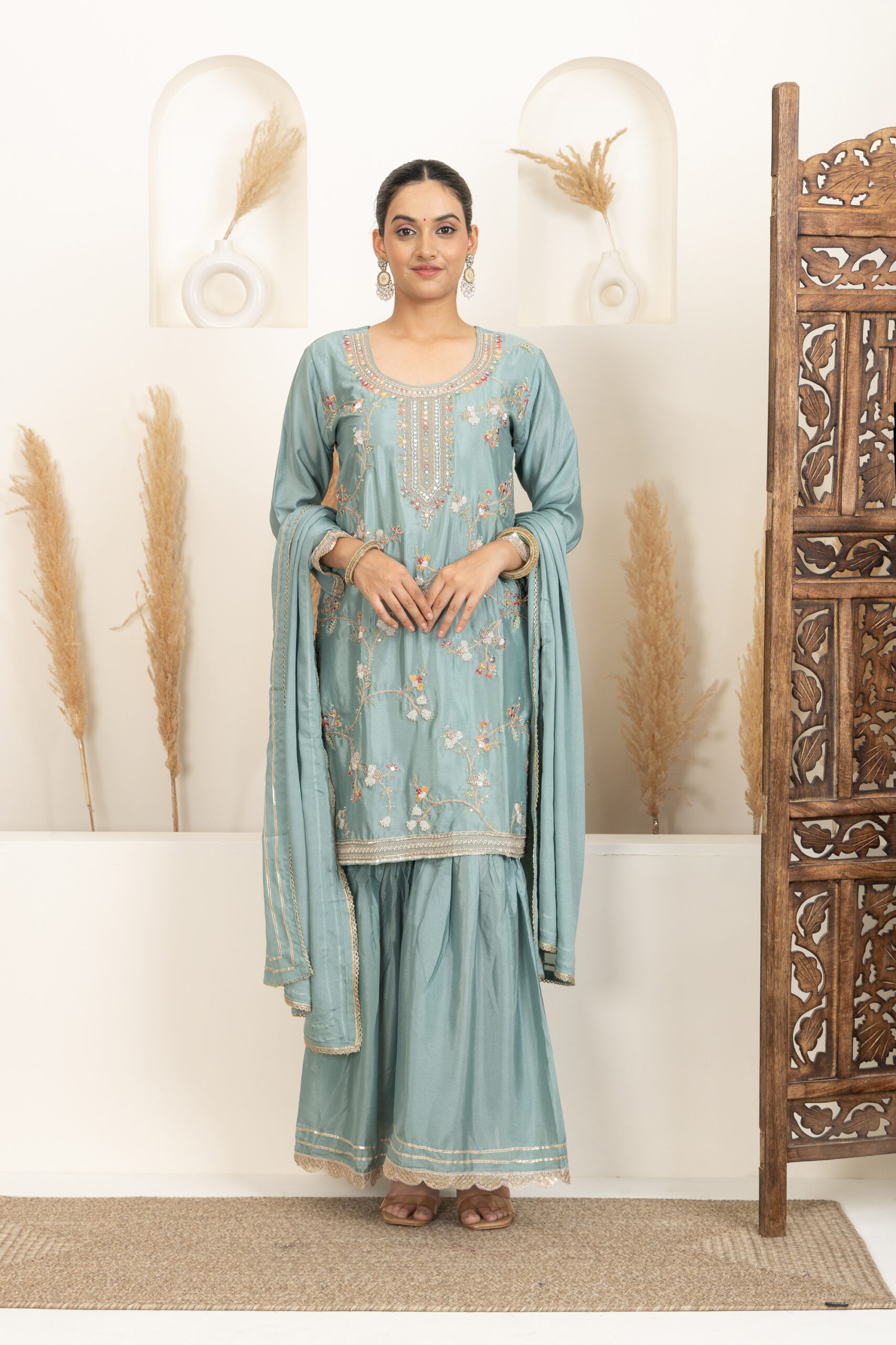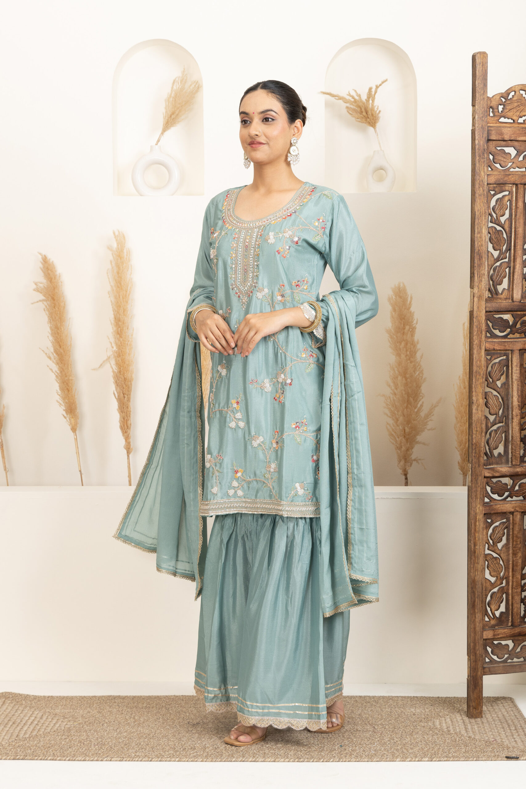 ● Bottom Fabric: Silk blend sharara with a flared silhouette
