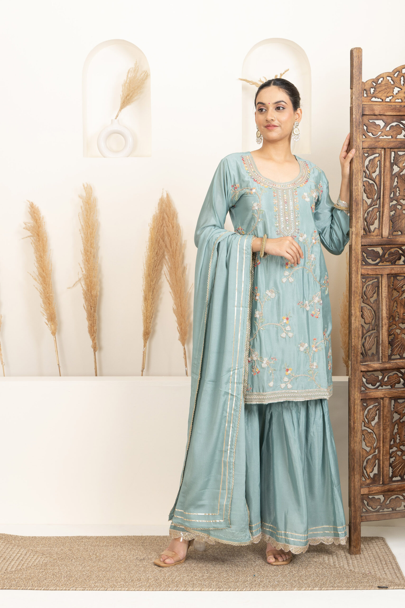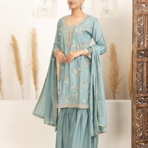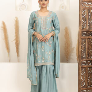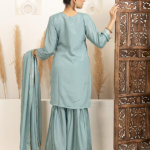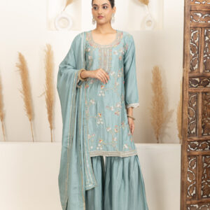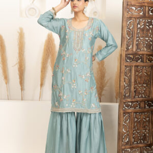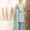 Overall Style: A graceful and festive sharara set perfect for celebrations and small functions. The soft colour and intricate detailing offer a blend of elegance and comfort