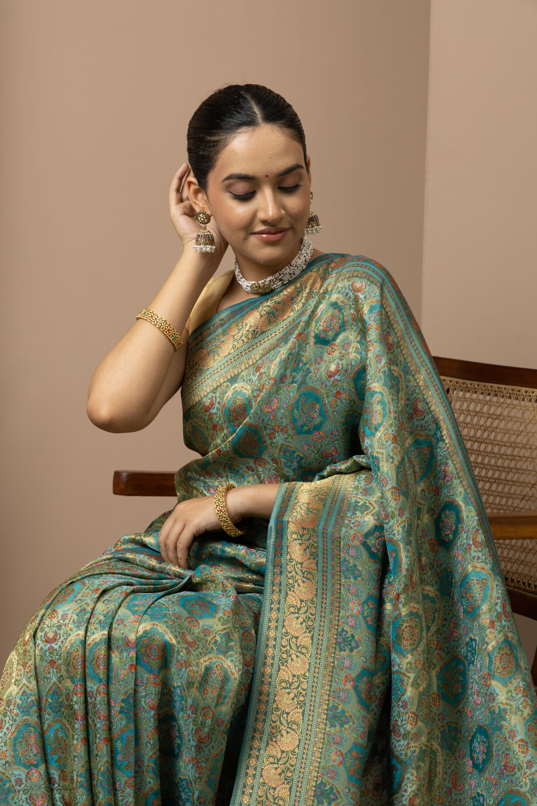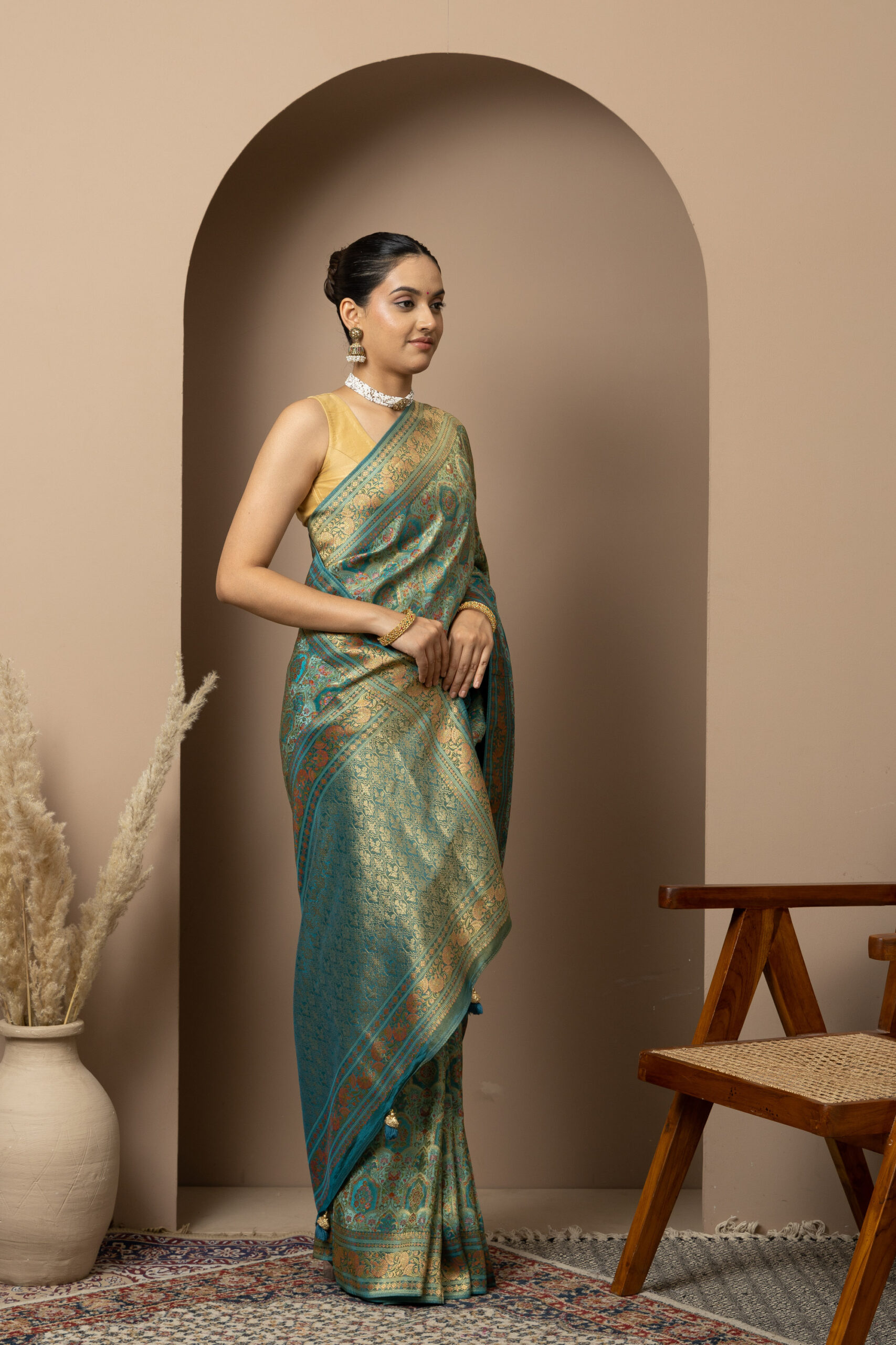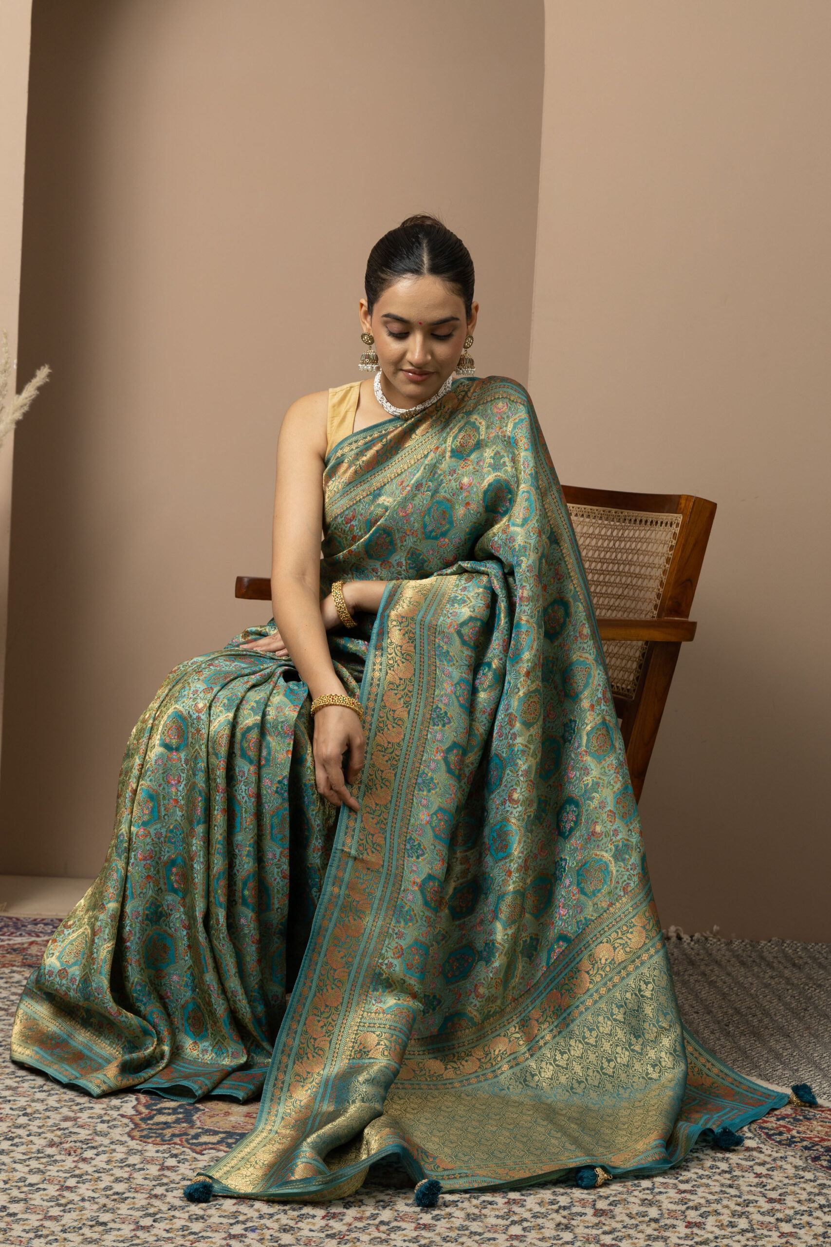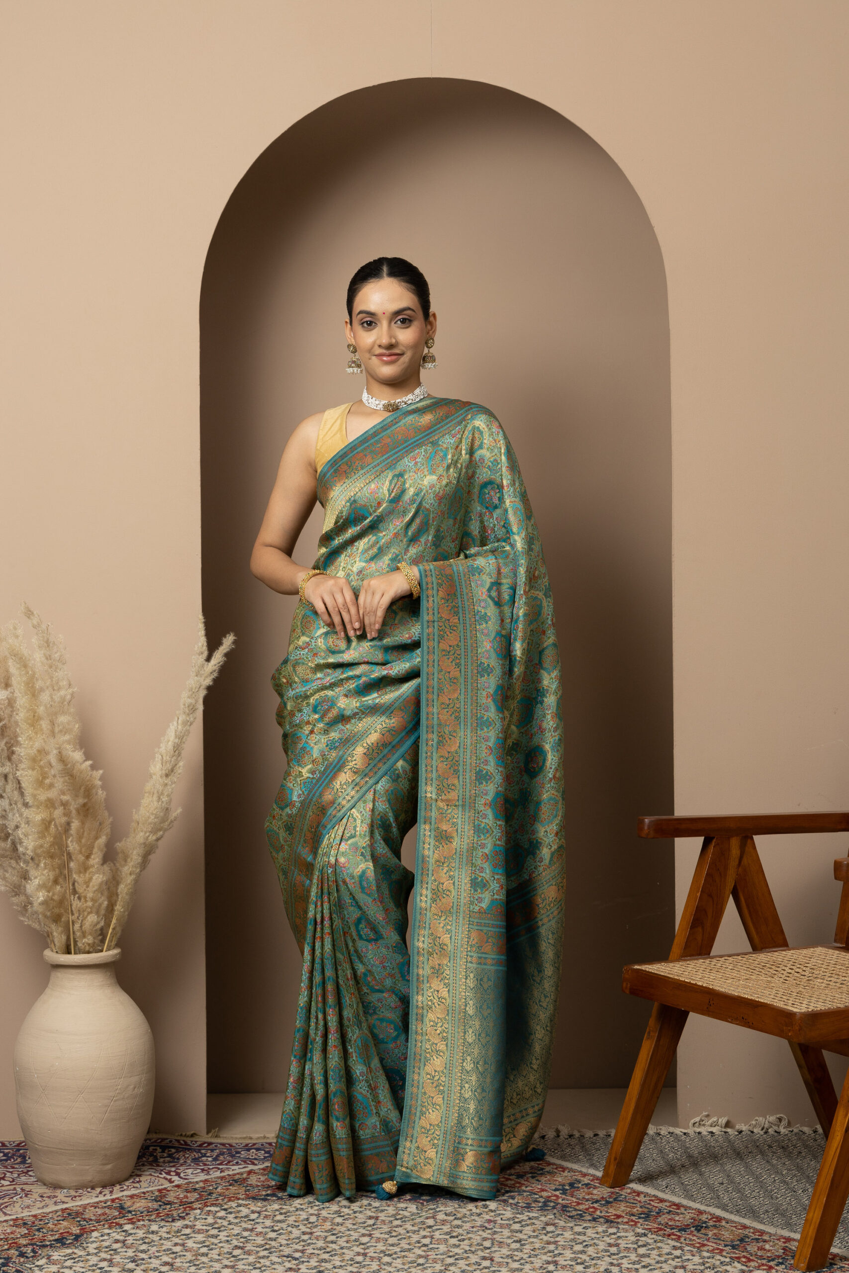 Overall Style: A statement saree crafted for grand occasions. Its rich colour palette and intricate zari detailing make it perfect for weddings, festive events, and special celebrations where you want to stand out.