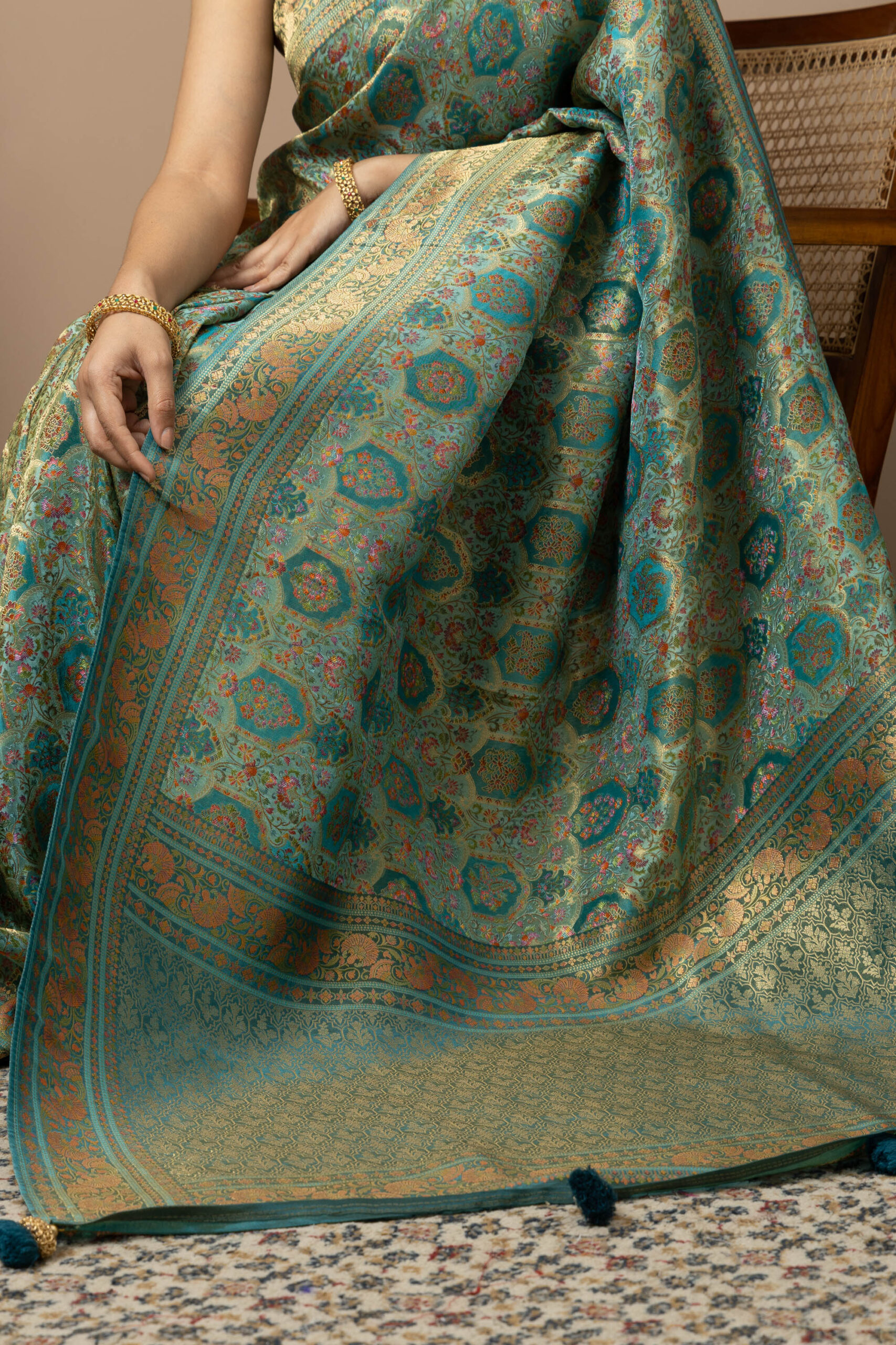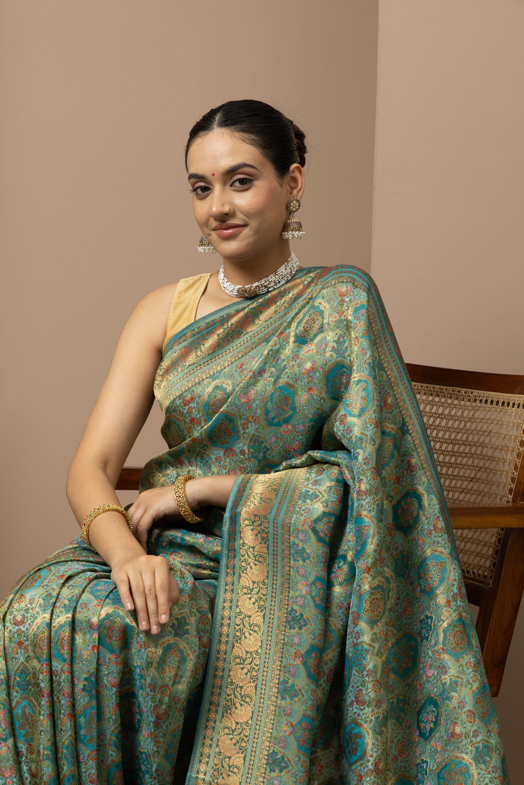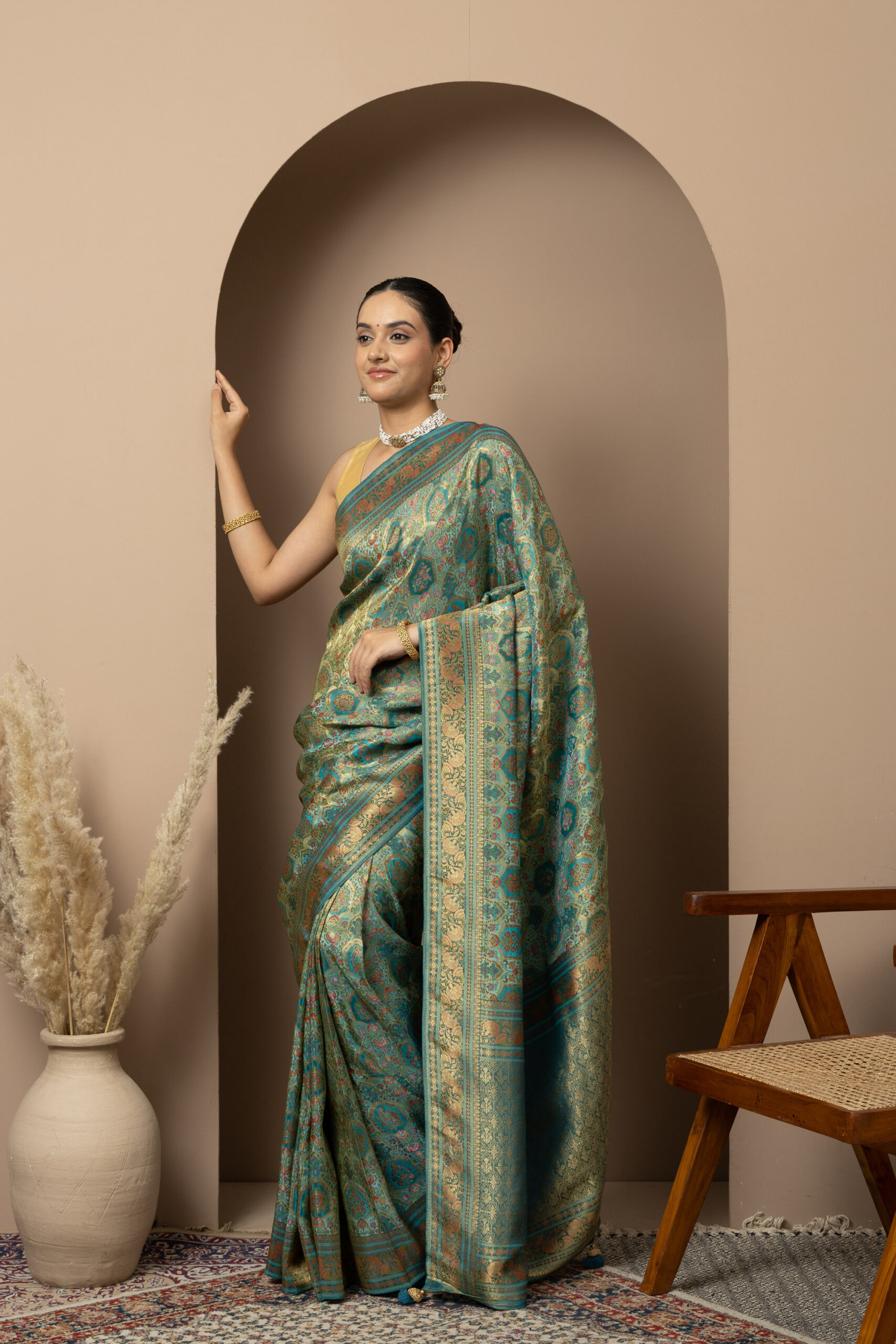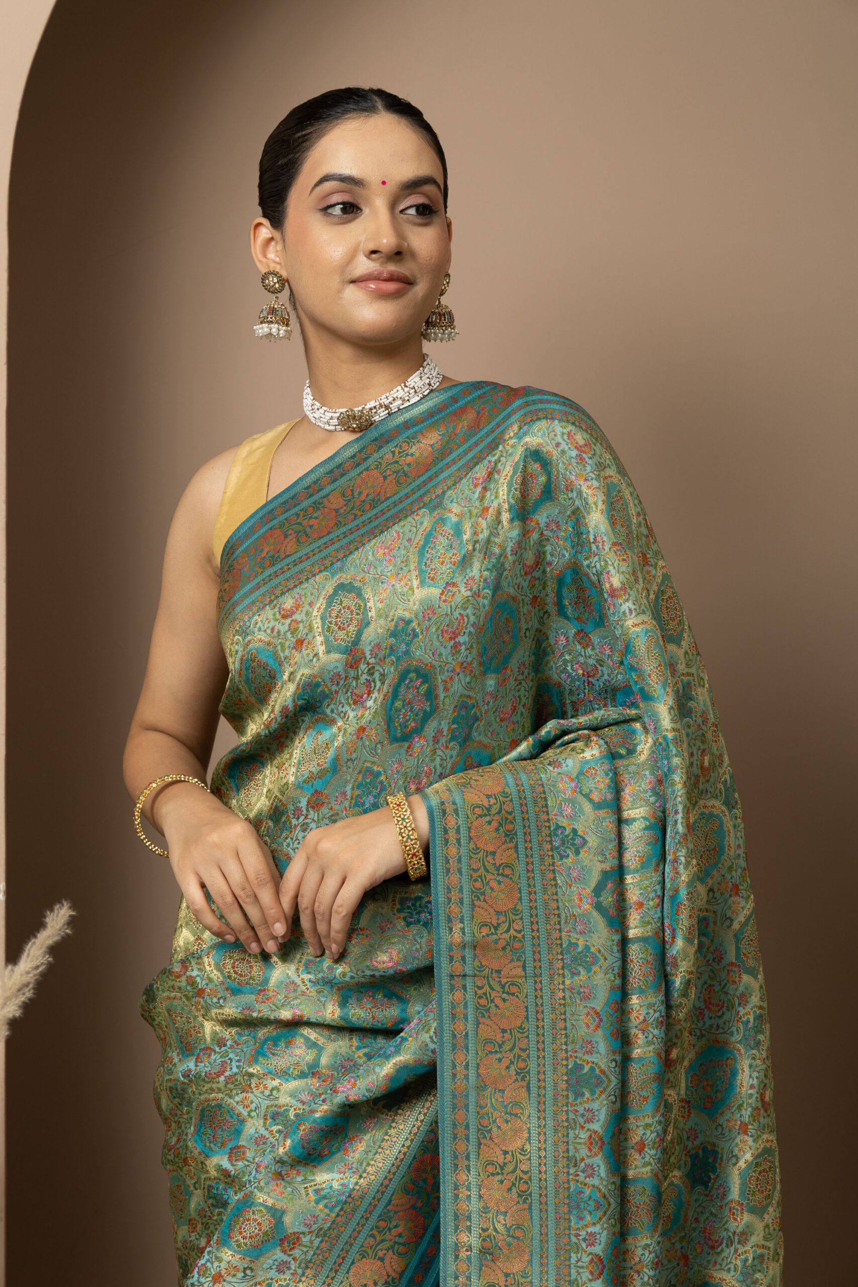 Overall Style: A statement saree crafted for grand occasions. Its rich colour palette and intricate zari detailing make it perfect for weddings, festive events, and special celebrations where you want to stand out.