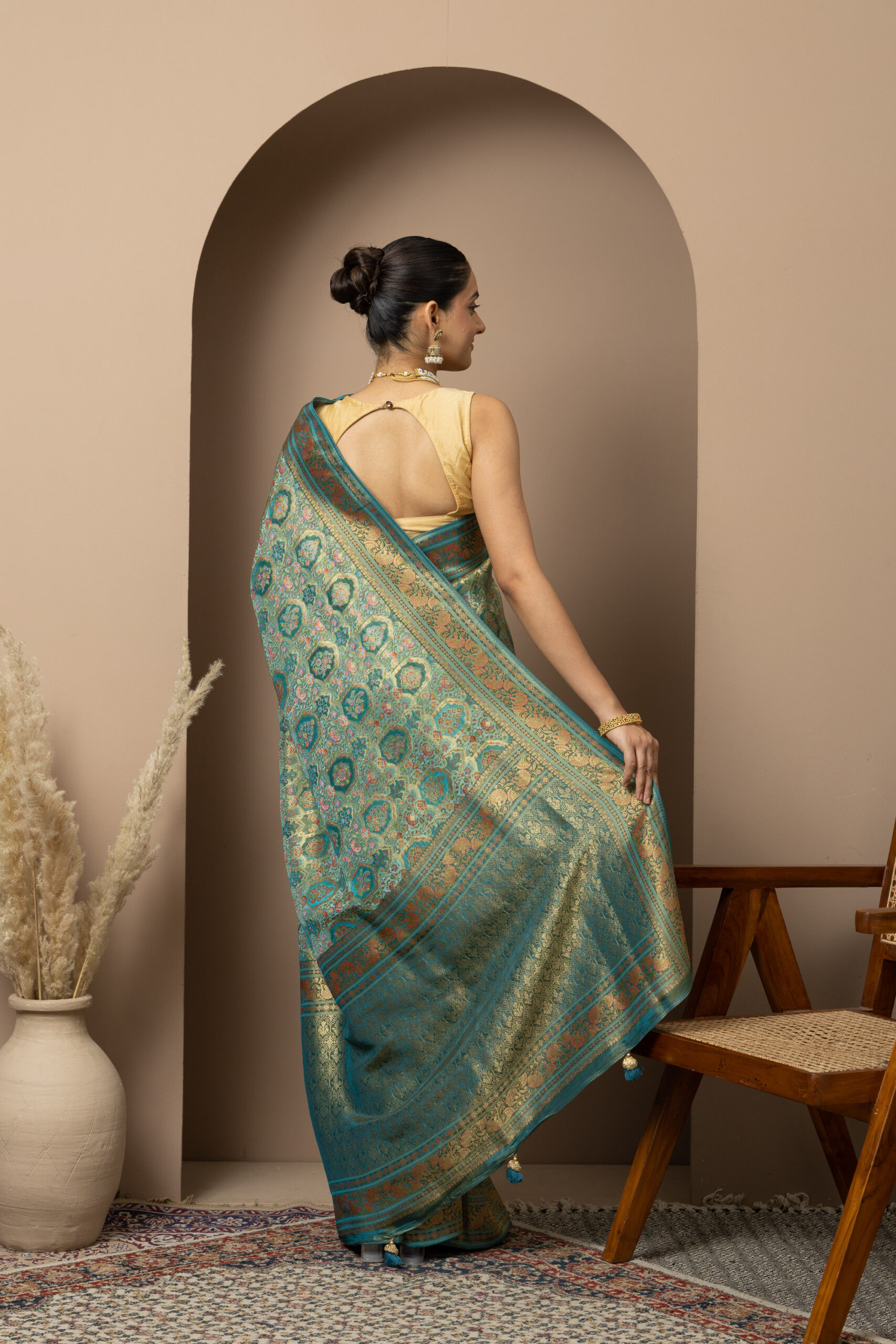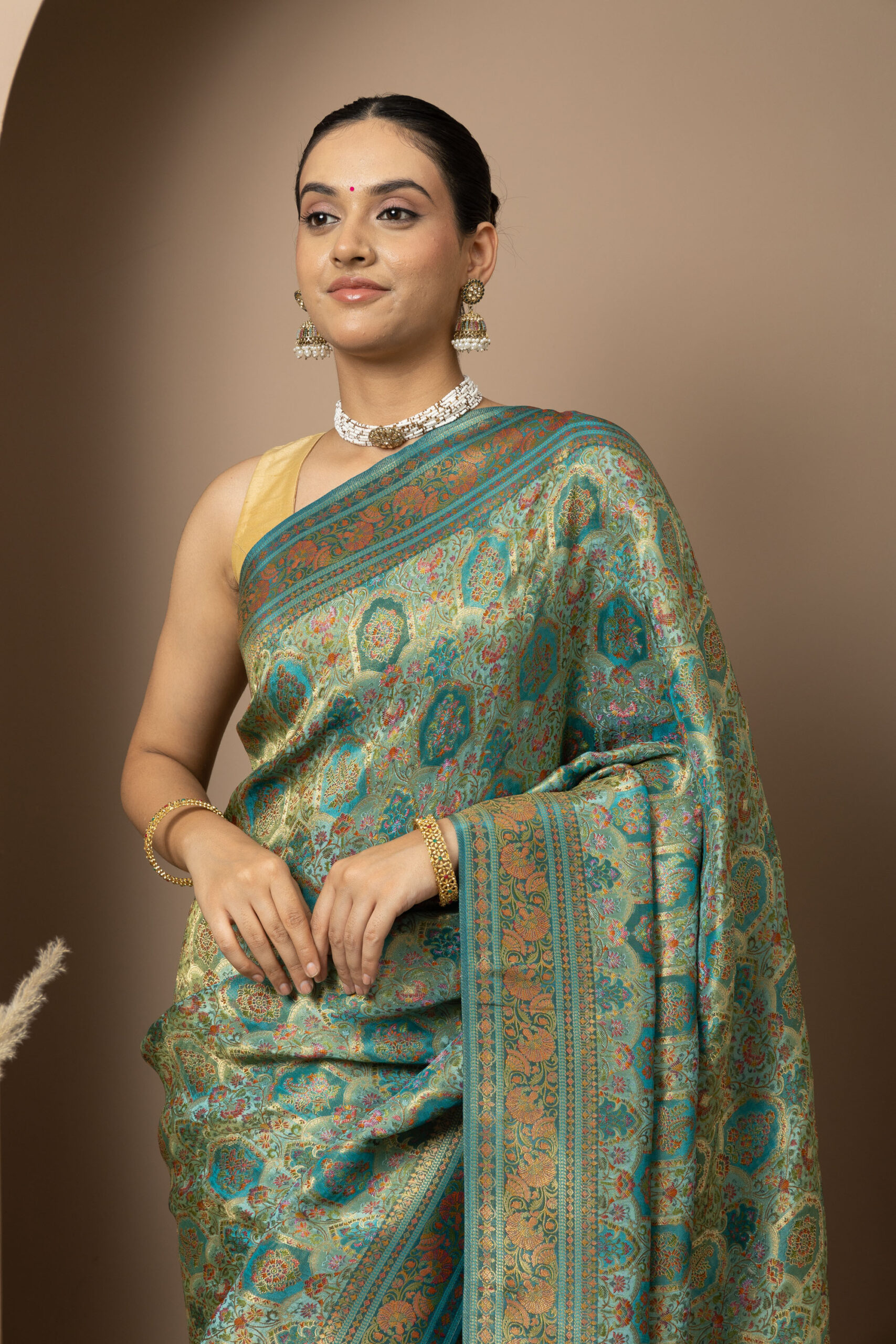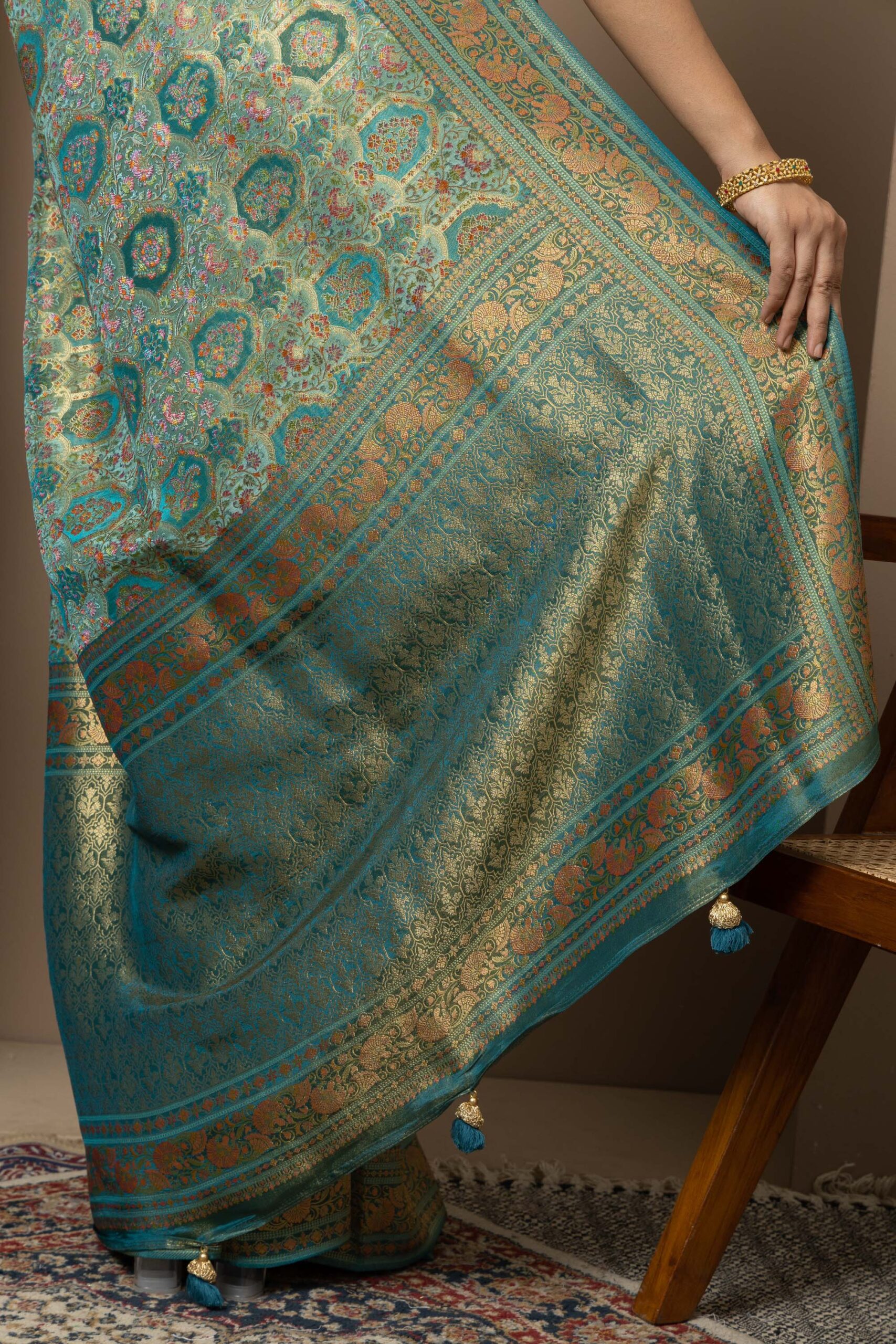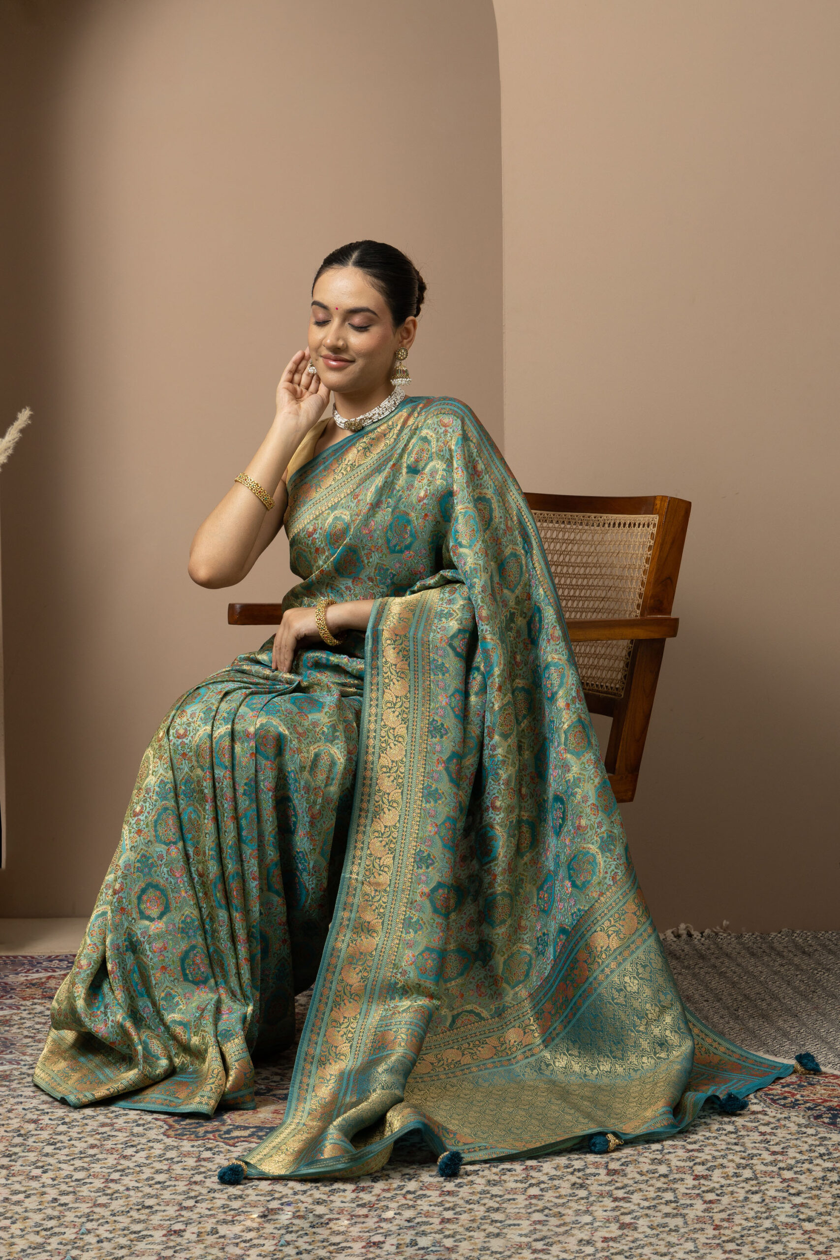 Overall Style: A statement saree crafted for grand occasions. Its rich colour palette and intricate zari detailing make it perfect for weddings, festive events, and special celebrations where you want to stand out.